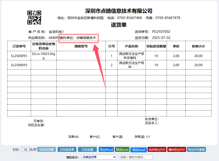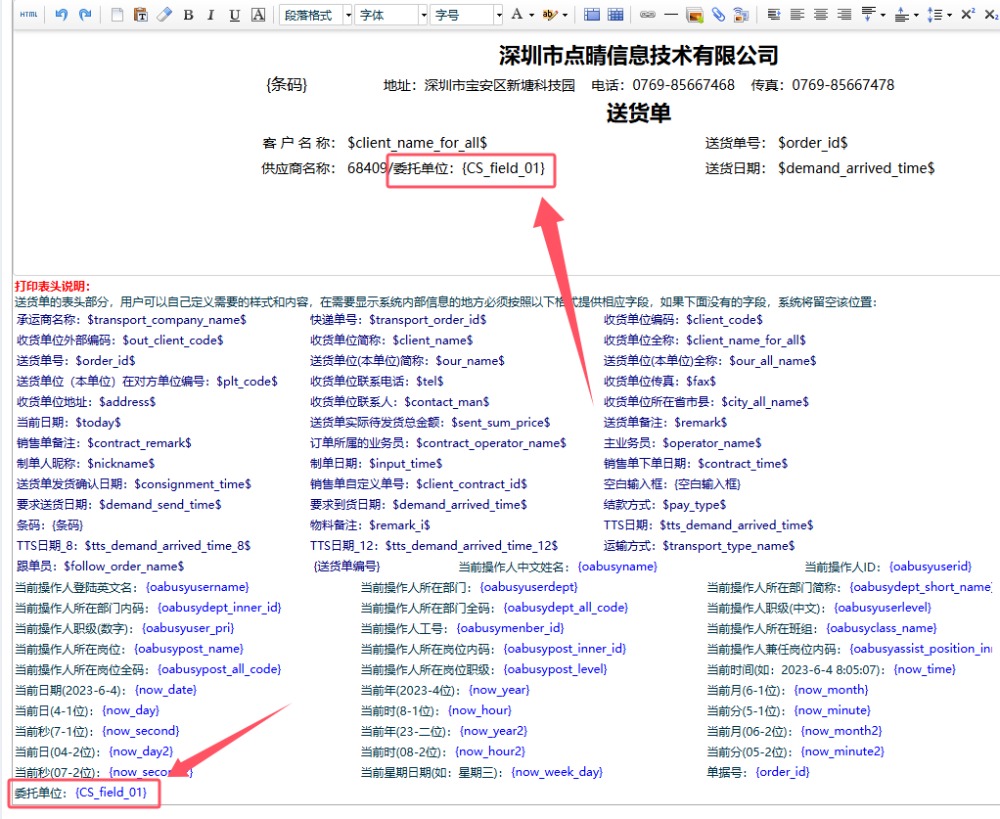 ?就會看到下面多了一個“委托單位:{CS_field_01}”,將其放到打印模板上適當(dāng)位置,打印時,就會看到多了這個自定義字段了: 點晴模切ERP更多信息:http://moqie.clicksun.cn,聯(lián)系電話:4001861886 該文章在 2025/7/9 10:18:54 編輯過 |