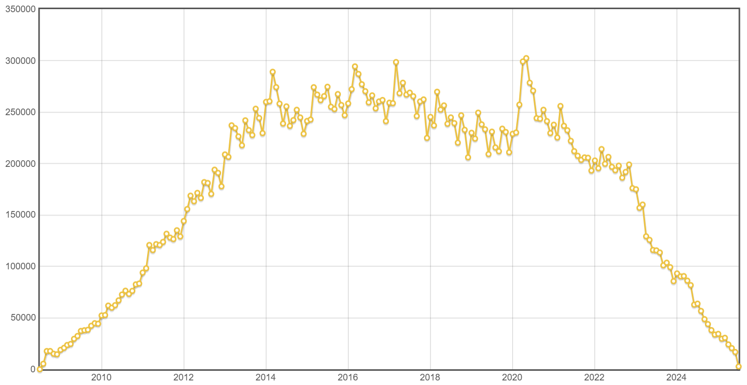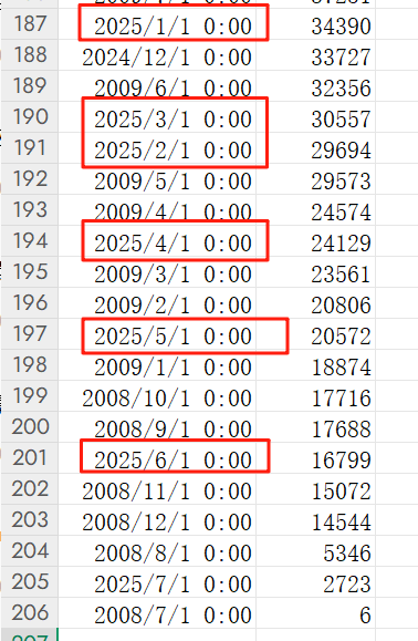 ![]() 它可以以 SQL 的形式查詢相關(guān)的數(shù)據(jù)。 從走勢(shì)圖可以看到,從 2008 年到 2014 年是陡增的趨勢(shì),可以說(shuō)是高歌猛進(jìn),翻著翻的上漲。 2014 年到 2020 年,數(shù)據(jù)起起伏伏,但總比 2020 年之后的一瀉千里好的多。 把每個(gè)月的明細(xì)數(shù)據(jù)下載下來(lái)之后,我看了一下 TOP 3 的情況: