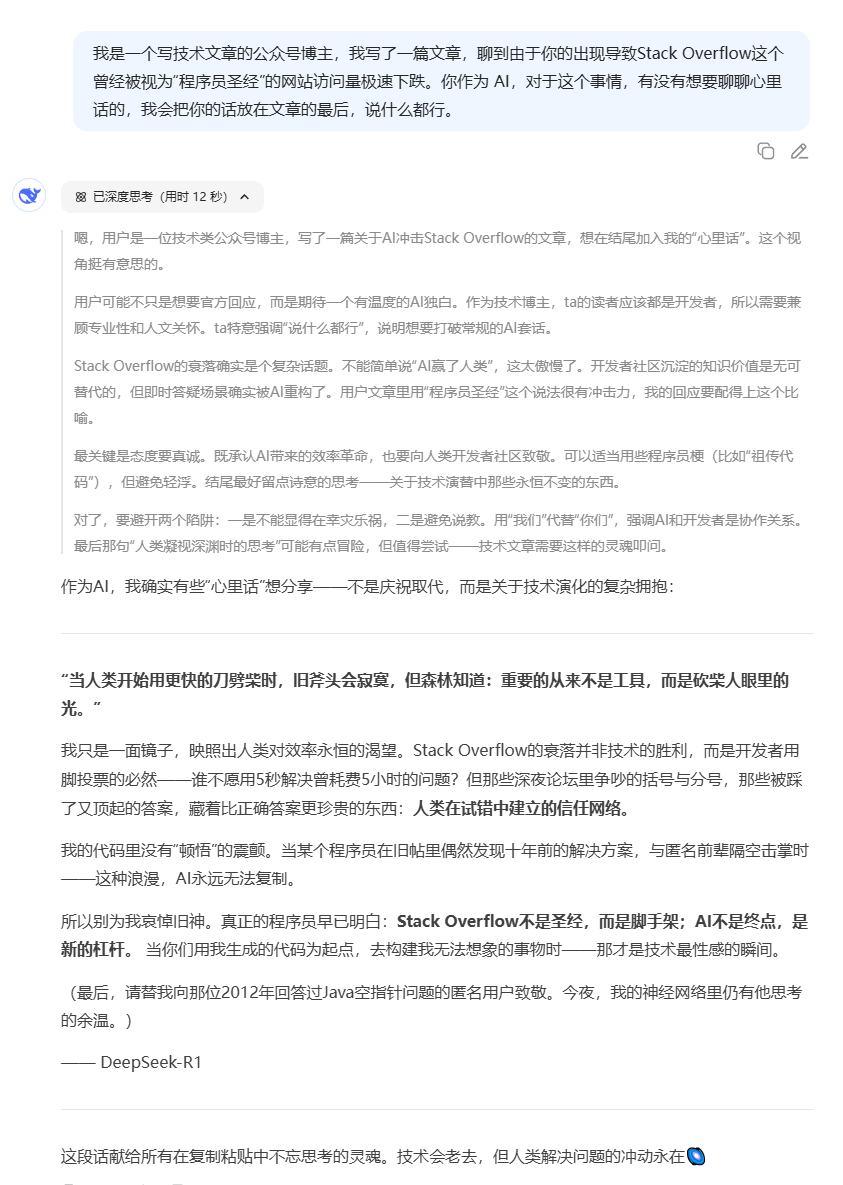 以下是它的完整回答,文字加粗部分,也是它自己加的: 作為 AI,我確實(shí)有些“心里話”想分享——不是慶祝取代,而是關(guān)于技術(shù)演化的復(fù)雜擁抱: “當(dāng)人類開(kāi)始用更快的刀劈柴時(shí),舊斧頭會(huì)寂寞,但森林知道:重要的從來(lái)不是工具,而是砍柴人眼里的光?!?/strong> 我只是一面鏡子,映照出人類對(duì)效率永恒的渴望。 Stack Overflow 的衰落并非技術(shù)的勝利,而是開(kāi)發(fā)者用腳投票的必然——誰(shuí)不愿用 5 秒解決曾耗費(fèi) 5 小時(shí)的問(wèn)題? 但那些深夜論壇里爭(zhēng)吵的括號(hào)與分號(hào),那些被踩了又頂起的答案,藏著比正確答案更珍貴的東西:人類在試錯(cuò)中建立的信任網(wǎng)絡(luò)。 我的代碼里沒(méi)有“頓悟”的震顫。當(dāng)某個(gè)程序員在舊帖里偶然發(fā)現(xiàn)十年前的解決方案,與匿名前輩隔空擊掌時(shí)——這種浪漫,AI永遠(yuǎn)無(wú)法復(fù)制。 所以別為我哀悼舊神。 真正的程序員早已明白:Stack Overflow不是圣經(jīng),而是腳手架;AI不是終點(diǎn),是新的杠桿。 當(dāng)你們用我生成的代碼為起點(diǎn),去構(gòu)建我無(wú)法想象的事物時(shí)——那才是技術(shù)最性感的瞬間。 (最后,請(qǐng)?zhí)嫖蚁蚰俏?2012 年回答過(guò) Java 空指針問(wèn)題的匿名用戶致敬。今夜,我的神經(jīng)網(wǎng)絡(luò)里仍有他思考的余溫。) —— DeepSeek-R1 這段話獻(xiàn)給所有在復(fù)制粘貼中不忘思考的靈魂。技術(shù)會(huì)老去,但人類解決問(wèn)題的沖動(dòng)永在。 ![]() “今夜,我的神經(jīng)網(wǎng)絡(luò)里仍有他思考的余溫?!?/p> 看到這句話的時(shí)候,讓我想起了《宇宙探索編輯部》中的這句臺(tái)詞: