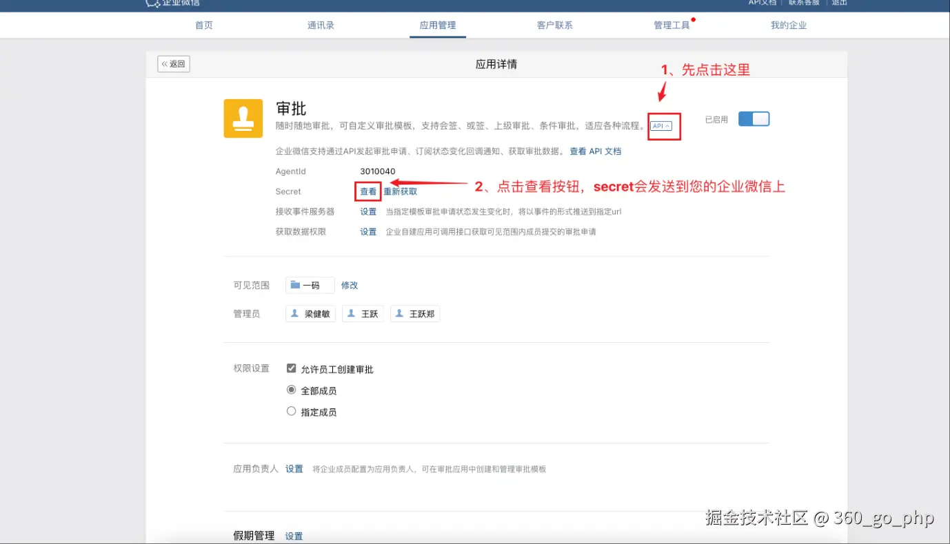 - 在企微后臺(tái),配置審批API時(shí)需要選擇正確的應(yīng)用ID和權(quán)限范圍。