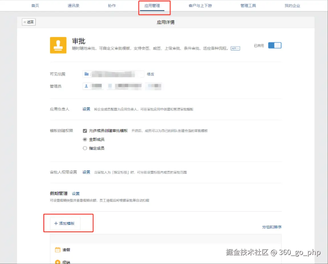 在“應(yīng)用管理”中,找到需要使用審批功能的應(yīng)用,并確保它已被授予審批API的訪問(wèn)權(quán)限。根據(jù)需要?jiǎng)?chuàng)建審批模板,配置審批流程。