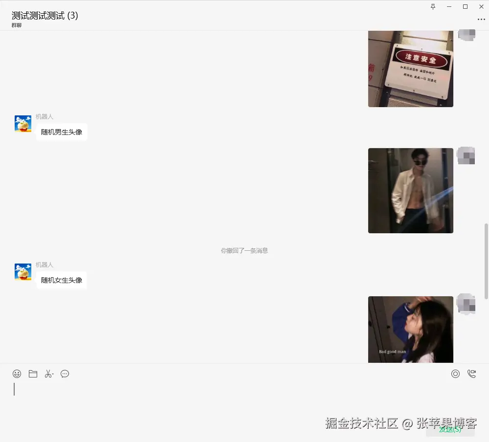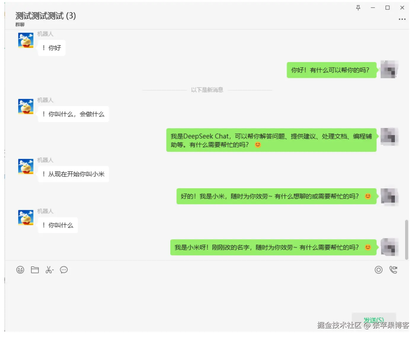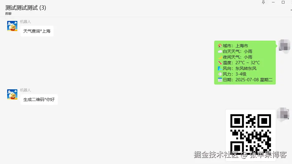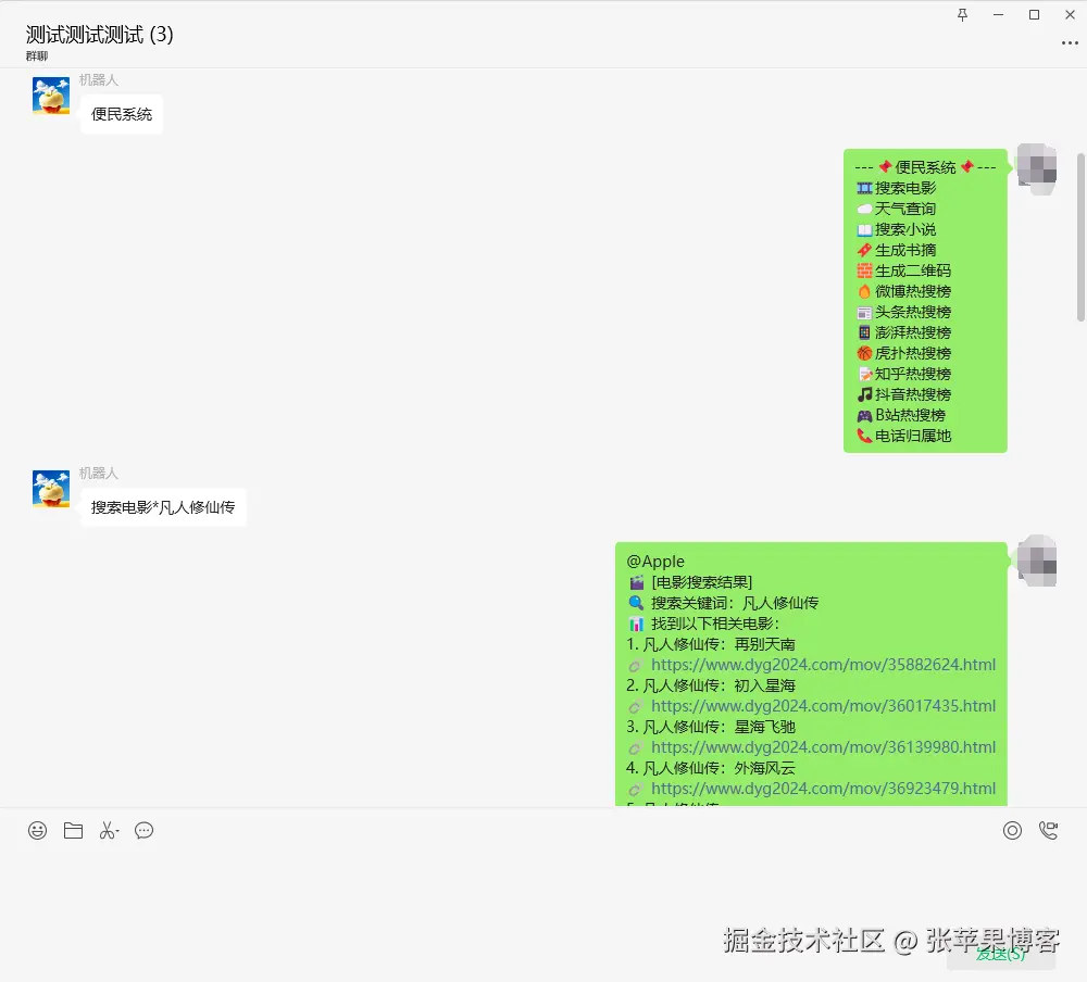 現(xiàn)在可以測試了! !!! warning 注意:如果您的群/好友窗口無任何歷史信息,或被清空過聊天記錄。請先發(fā)送一條信息,再重新啟動(dòng)服務(wù)監(jiān)聽,具體可看上方視頻。 !!!