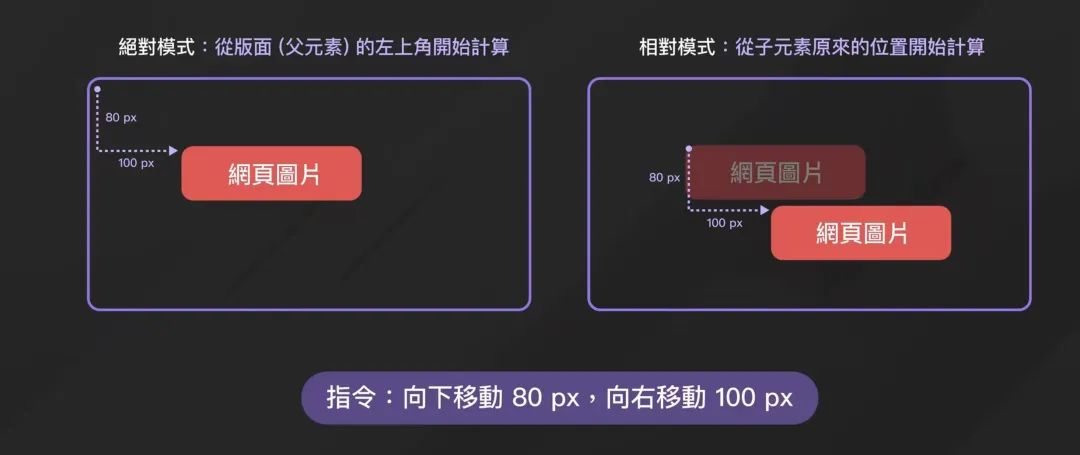 效果:元素從原位置向上移動(dòng) 10px,向右移動(dòng) 20px,原位置留白。 使用相對(duì)模式時(shí),網(wǎng)頁元素會(huì)從它原本的位置進(jìn)行移動(dòng) 核心特性 1. 基準(zhǔn)點(diǎn):相對(duì)于元素自身在文檔流中的原始位置進(jìn)行偏移。 2. 文檔流影響: ? ? 不脫離文檔流:元素偏移后,原位置仍保留空白空間(其他元素布局不變)。 ? ? 不影響其他元素:偏移僅改變自身渲染位置,不擠壓或覆蓋周圍元素。 3. 顯示模式:標(biāo)簽的原始顯示模式(如塊級(jí)、行內(nèi))保持不變。 使用場(chǎng)景 ? 微調(diào)元素位置:如按鈕懸停時(shí)輕微上移、圖標(biāo)偏移等。 ? 創(chuàng)建定位上下文:為子元素的 absolute 定位提供參照容器(父元素設(shè)置 position: relative 但不設(shè)偏移)。 ?? 二、absolute(絕對(duì)定位)