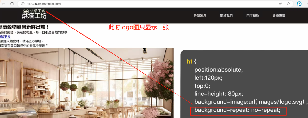 你可以看到<h1>文字的后面不僅被圖片重疊,而且此時有兩張呈縱向分布的logo圖。別擔(dān)心,我們一步步來,首先是logo重復(fù)的問題,這涉及到圖片的平鋪方式。 ?? 2. 關(guān)鍵輔助屬性 ? background-repeat 控制圖片平鋪方式: