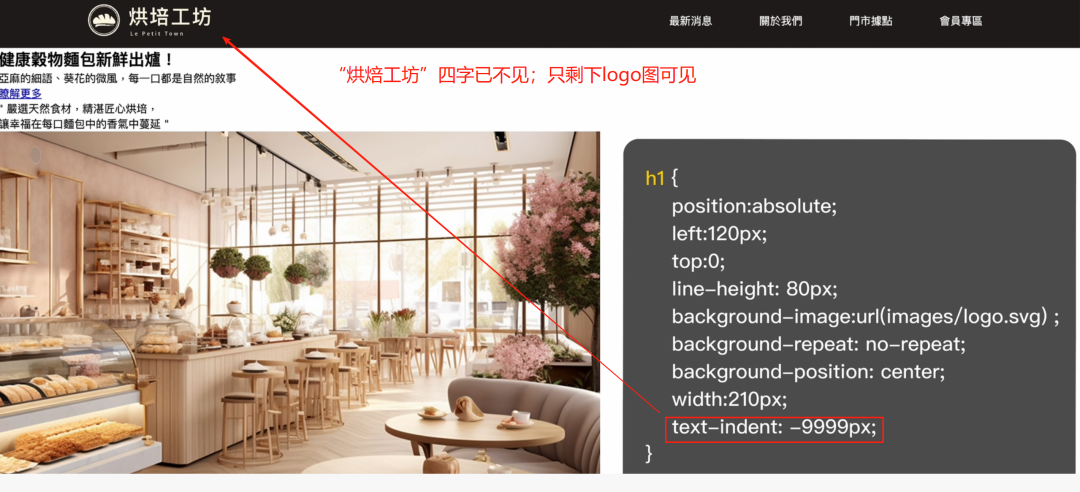 我們要達(dá)到看不見文字的效果,就可以用這個語法將<h1>文字推到很遠(yuǎn)很遠(yuǎn)很遠(yuǎn)的地方。