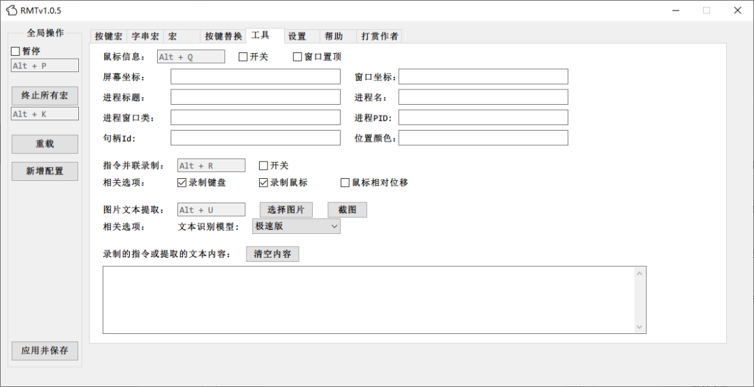 這是一款基于 AutoHotkey v2 的免費(fèi)開源按鍵宏工具,旨在讓用戶通過(guò)簡(jiǎn)單的配置即可實(shí)現(xiàn)多種自動(dòng)化操作。該工具支持按鍵宏、鼠標(biāo)宏以及手柄宏的錄制和播放,并集成了圖片識(shí)別、顏色識(shí)別和文本識(shí)別等多種功能,能夠滿足從游戲輔助到提升辦公效率的多種需求。無(wú)論是需要重復(fù)性操作的任務(wù),還是復(fù)雜的交互流程,RMT 都可以通過(guò)一鍵化的方式輕松處理,讓你的工作和娛樂(lè)變得更加輕松和高效。把這個(gè)任務(wù)交給代碼,那么我就可以去做更有意義的事情了!