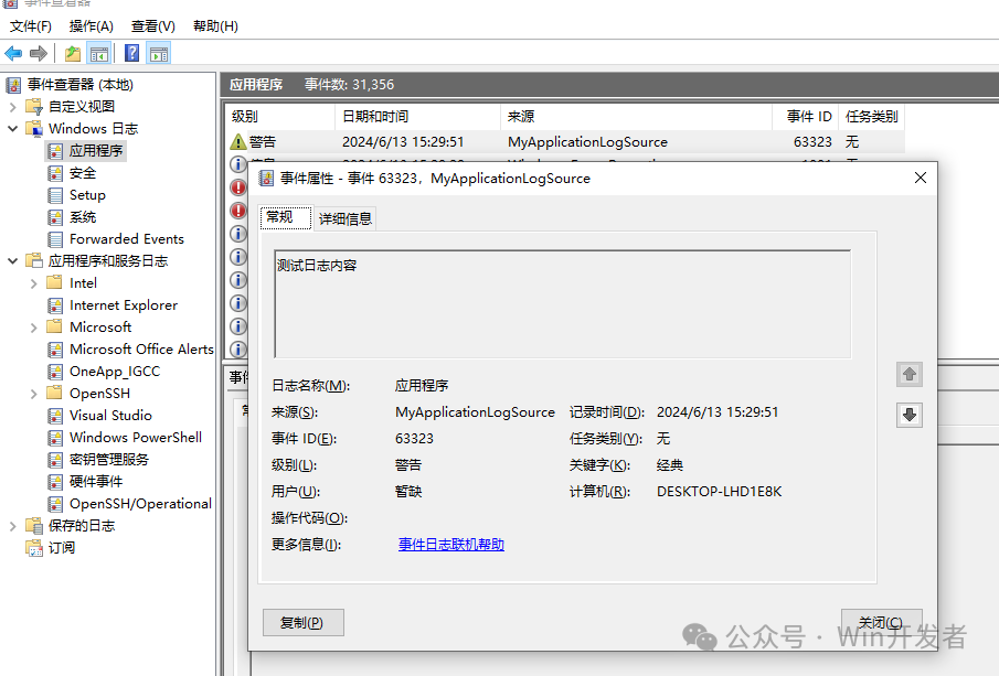創(chuàng)建日志寫入記錄到系統(tǒng)日志下這里以【應(yīng)用程序】日志為例,操作如下: