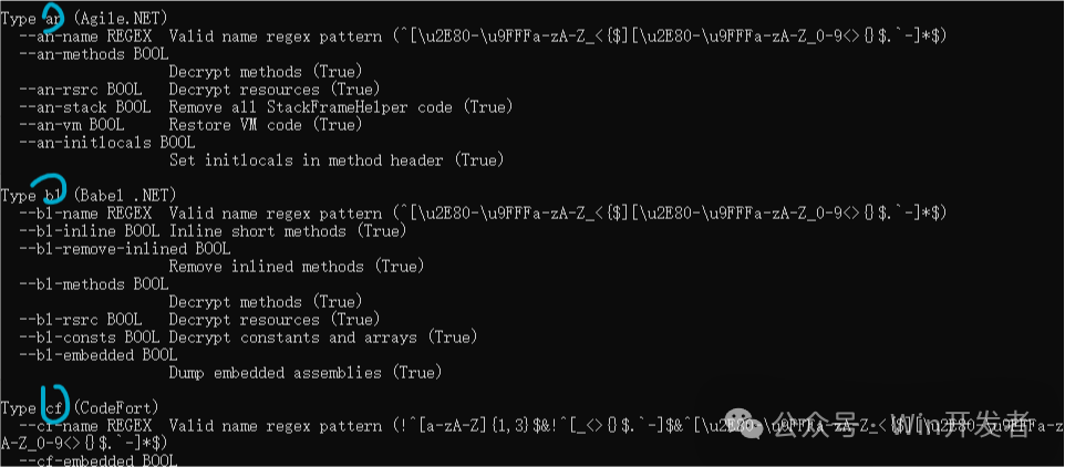 5、指定混淆工具名稱 de4dot可能檢測不準(zhǔn)確混淆工具的名稱,可以通過 -p 參數(shù)指定 1 de4dot file1.dll -p sa de4dot中支持的完整的混淆工具簡寫可以在不帶參數(shù)運行時的界面上看到