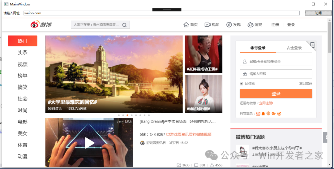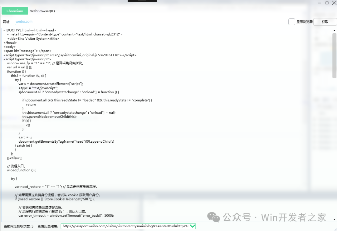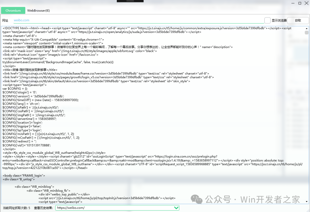 5、處理獲取到的網(wǎng)頁源碼 在ChromiumWebBrowser.FrameLoadEnd事件實(shí)現(xiàn)里可以獲取到網(wǎng)頁的動(dòng)態(tài)源碼。 這里需要注意的是,當(dāng)你打開一個(gè)動(dòng)態(tài)頁面,這個(gè)事件可能 會(huì)觸發(fā)多次, 比如你打開weibo.com,這個(gè)事件就會(huì)觸發(fā)多次。 1 private async void Chrome_FrameLoadEnd(object sender, FrameLoadEndEventArgs e) 2 { 3 string source = await chrome.GetSourceAsync(); 4 } 使用CEF無法確定一個(gè)網(wǎng)站是否已經(jīng)完全加載完成,我們只能在它每一次加載完成時(shí), 處理它的頁面源碼。 如果需要主動(dòng)等待網(wǎng)站加載完成,可以試試使用Selenium https://www.cnblogs.com/zhaotianff/p/11330810.html 比如打開weibo.com時(shí),會(huì)獲取到多次頁面源碼,結(jié)果如下(這里只貼出前面兩次的結(jié)果): 獲取到源碼以后可以使用HtmlAgilityPack、AngleSharp等解析庫來解析HTML,也可以使 用CEF執(zhí)行js實(shí)現(xiàn)同樣的功能 調(diào)用ChromiumWebBrowser.EvaluateScriptAsync函數(shù)就可以執(zhí)行js,函數(shù)返回值可以獲 取到j(luò)s執(zhí)行的結(jié)果。 示例代碼 https://files-cdn.cnblogs.com/files/zhaotianff/CEFSharpDemo.zip 閱讀原文:原文鏈接 該文章在 2025/7/18 11:07:46 編輯過 |