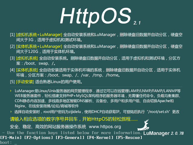 HttpOS2.1基于CentOS5.8構(gòu)建,是一個(gè)已經(jīng)集成了LuManager的網(wǎng)站服務(wù)器操作系統(tǒng),針對(duì)網(wǎng)站服務(wù)進(jìn)行了優(yōu)化和精簡(jiǎn),為的是讓不懂任何命令的朋友也能使用優(yōu)秀的Linux構(gòu)建LAMP/LNMP/LANMP組件的網(wǎng)站服務(wù)系統(tǒng),完美支持Discuz、Phpwind、Shopex、 ECShop、Ecmall、Wordpress、Dedecms、PHP168等常用php+mysql結(jié)構(gòu)程序。
