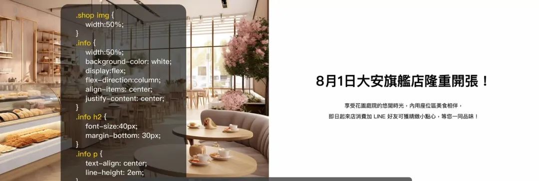 當(dāng)你用Flexbox輕松實(shí)現(xiàn)導(dǎo)航欄、卡片流之后,是否遇到這樣的場(chǎng)景:左側(cè)需要展示精美環(huán)境圖,右側(cè)要放置活動(dòng)文案? 這類「圖文左右分列」布局正是商業(yè)網(wǎng)站的高頻需求!今天我們就用Flexbox的延伸技巧,實(shí)現(xiàn)像示例中咖啡店宣傳頁(yè)一樣的顏值+信息量雙贏設(shè)計(jì)?? 你將掌握: ? 精準(zhǔn)控制圖文左右/上下排列邏輯 ? 自適應(yīng)留白技巧(告別擁擠版面) ? 多區(qū)塊元素同步對(duì)齊的工業(yè)級(jí)方案 ?左右分欄設(shè)計(jì)依然用flexbox來制作,但是我們需注意到,上圖版面的的section中,有3個(gè)區(qū)塊元素:<img>、<h2>、<p>