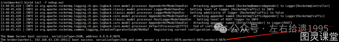 3.5.2 啟動(dòng)NameServerNameServer的配置修改完成,然后我們用靜默啟動(dòng)的方式啟動(dòng)NameServer服務(wù),啟動(dòng)完成后在nohup.out里看到這一條關(guān)鍵日志就是啟動(dòng)成功。并且使用jps指令可以看到有一個(gè)NamesrvStartup進(jìn)程。