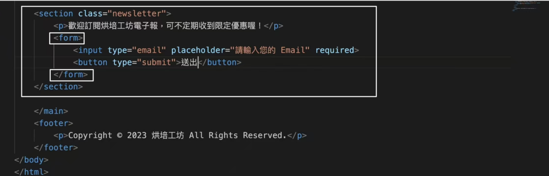 html實(shí)操示例 那今天假設(shè)我們要在頁尾,也就是<footer>標(biāo)簽上方,設(shè)計(jì)一個表單,用以收集用戶的email信息。我們一起來看看該如何操作吧。 1.首先我們在<footer>標(biāo)簽上方新建一個<section>,class命名為"newsletter"(此處同樣,可按照個人習(xí)慣命名) 2.在<section>內(nèi),新建一個<form>標(biāo)簽 3.在<form>表單標(biāo)簽內(nèi),插入<input>標(biāo)簽 示例代碼: 示例代碼解析: