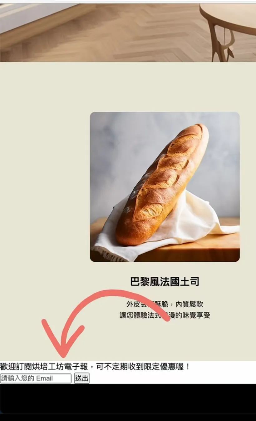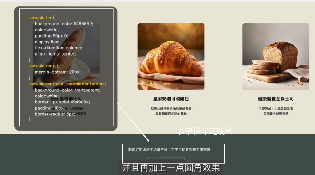 主要模塊 ? 電子報(bào)訂閱區(qū)塊 (section#newsletter) ? 包含標(biāo)題說明(<p>標(biāo)簽的中文提示) ? 表單(<form>)含兩個核心元素: ? 郵箱輸入框:<input type="email"> 限制用戶只能輸入有效郵箱格式 ? 提交按鈕:<button type="submit"> 觸發(fā)表單數(shù)據(jù)提交 注意:上述表單未定義action(數(shù)據(jù)提交地址)和method(GET/POST請求方式),提交后無法處理數(shù)據(jù)。 (由于我們當(dāng)前處于零基礎(chǔ)新手階段,只先對前端設(shè)計(jì)部分做一個大致的了解。至于表單提交后如何與后臺服務(wù)器做互動,我們這里就先暫且省略了。) 此時(shí)我們的表單欄框架已通過html搭建好 框架目前是很粗糙的,接下來就又到了CSS的美化環(huán)節(jié)啦。 CSS美化部分 整體功能解析
