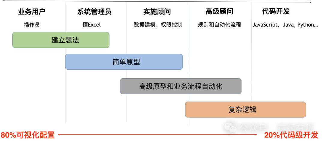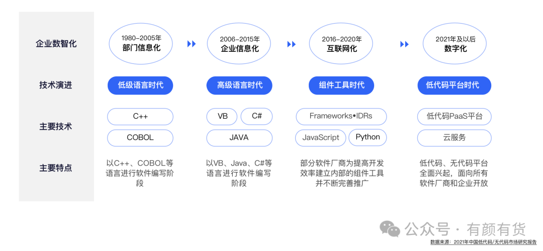 縱觀過往,細(xì)心的我們可以發(fā)現(xiàn),IT圈的風(fēng)口總是經(jīng)歷了一輪又一輪。但是,當(dāng)浪潮退去,還能幸存的,才能是真正具備社會(huì)價(jià)值的產(chǎn)品。把這個(gè)規(guī)則放在——“低代碼”這個(gè)賽道上,也是一樣。個(gè)人認(rèn)為,低代碼將是未來企業(yè)數(shù)字化轉(zhuǎn)型中必不可少的要素之一。說到低代碼是怎么火的,這里我們或許可以先聊聊它的起源。早期,低代碼其實(shí)并不是傳統(tǒng)編碼模式(coding)的對(duì)立面,甚至和傳統(tǒng)編碼是相輔相成共同促進(jìn)的。其實(shí)在任何一門代碼語言中,代碼編寫框架化、模塊化一直都是語言發(fā)展的方向。各類IDE工具例如:Pycharm、Visual Studio Code 這些,其實(shí)你也可以理解為是低代碼的一種存在形式。簡單來說【低代碼】,可以理解為就是如何能夠使用更高效的編程方式開發(fā)出業(yè)務(wù)系統(tǒng)。廣義上來說,以下的幾個(gè)概念都可以劃為低代碼范疇: