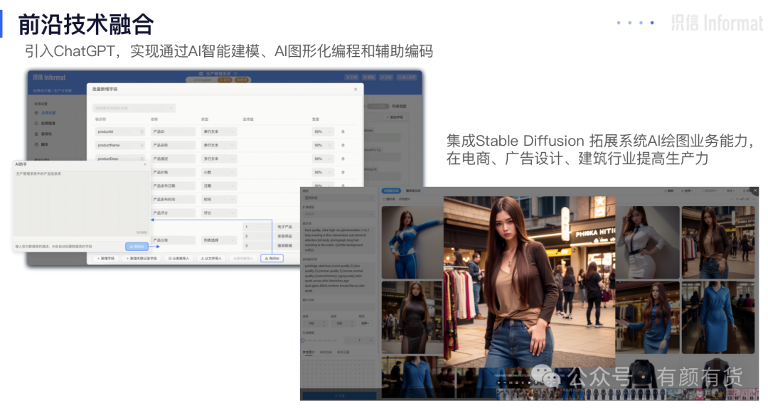除了能夠支持常規(guī)的信息化系統(tǒng)的開發(fā),隨著市場發(fā)展的需求,新的技術(shù)融入能夠和低代碼一起產(chǎn)生不一樣的化學(xué)反應(yīng)。例如 AIGC 概念的異軍突起,織信低代碼也積極響應(yīng),率先和 ChatGPT、Stable Diffusion 實(shí)現(xiàn)對(duì)接。通過和ChatGPT的對(duì)接,實(shí)現(xiàn)了業(yè)務(wù)系統(tǒng)的AI智能開發(fā),進(jìn)一步提升開發(fā)效率。而 Stable Diffusion 作為AI圖片領(lǐng)域的重要模型,集成到織信后,織信平臺(tái)可以在相關(guān)圖片業(yè)務(wù)場景中,實(shí)現(xiàn)AI文生圖、圖生圖需求的快速調(diào)用。服務(wù)于電商、設(shè)計(jì)、廣告等領(lǐng)域,極大提高了業(yè)務(wù)生產(chǎn)力。?