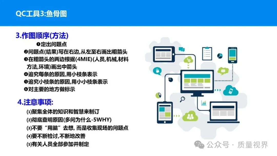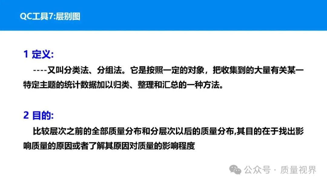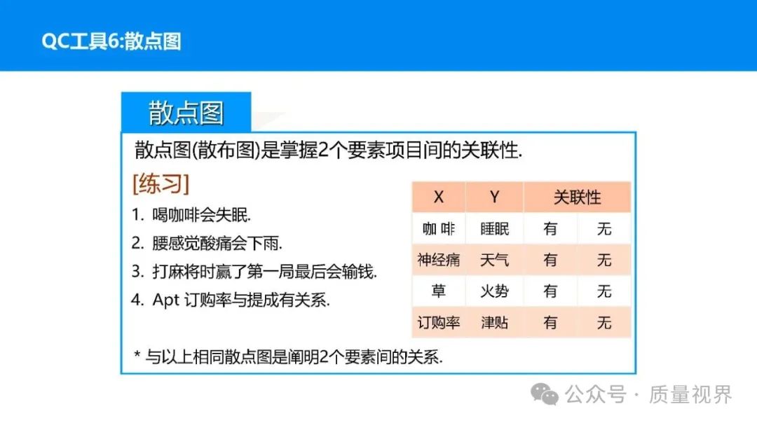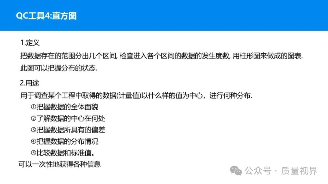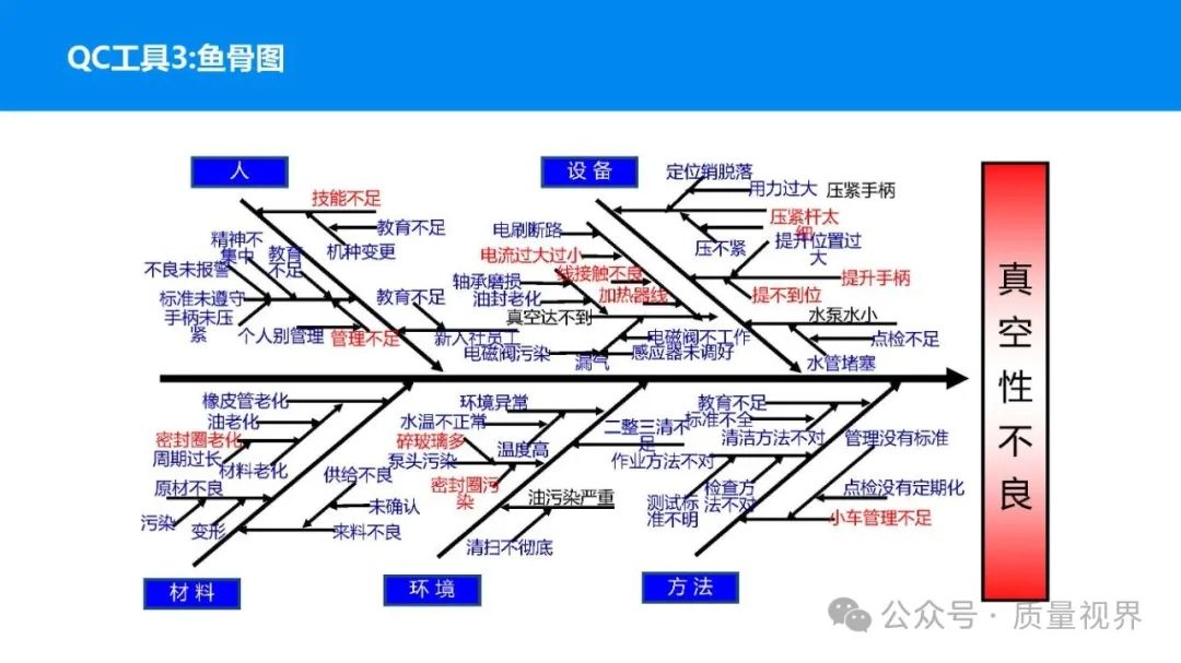 在質(zhì)量管理領(lǐng)域,七大工具是提升產(chǎn)品質(zhì)量、優(yōu)化流程的重要手段。它們操作簡便、實(shí)用性強(qiáng),能幫助我們從復(fù)雜的數(shù)據(jù)和現(xiàn)象中找到關(guān)鍵問題,為質(zhì)量改進(jìn)提供明確方向。以下將逐一介紹這七大工具。檢查表是一種為收集和整理數(shù)據(jù)而設(shè)計(jì)的表格,它能讓數(shù)據(jù)收集過程更有條理,避免遺漏關(guān)鍵信息。可以系統(tǒng)地收集特定問題的數(shù)據(jù),為后續(xù)的分析提供可靠依據(jù)。比如在生產(chǎn)車間,可用于記錄每天產(chǎn)品的不合格項(xiàng)數(shù)量及類型。(二)制作步驟明確收集數(shù)據(jù)的目的,比如是為了了解某產(chǎn)品的不合格原因分布。確定需要收集的數(shù)據(jù)項(xiàng)目,如不合格類型、發(fā)生時(shí)間、發(fā)生地點(diǎn)等。設(shè)計(jì)表格樣式,將數(shù)據(jù)項(xiàng)目合理排列。確定數(shù)據(jù)收集的周期和負(fù)責(zé)人。按照表格要求進(jìn)行數(shù)據(jù)填寫。某電子廠為了解手機(jī)屏幕的不合格情況,設(shè)計(jì)檢查表記錄每天的不合格類型,如劃痕、亮點(diǎn)、暗點(diǎn)等。一周后,通過檢查表數(shù)據(jù)能直觀看到劃痕問題出現(xiàn)的次數(shù)最多,為后續(xù)解決該問題提供了數(shù)據(jù)支持。柏拉圖又稱排列圖,它基于 “關(guān)鍵的少數(shù),次要的多數(shù)” 原則,將數(shù)據(jù)按重要程度排序,以柱狀圖和折線圖結(jié)合的形式展示,幫助識(shí)別主要問題。能快速找出影響質(zhì)量的主要因素,讓我們把精力集中在關(guān)鍵問題上,提高質(zhì)量改進(jìn)的效率。(二)制作步驟確定分析的問題和數(shù)據(jù)范圍,比如某產(chǎn)品的不合格原因及對應(yīng)數(shù)量。對數(shù)據(jù)進(jìn)行分類統(tǒng)計(jì),計(jì)算各類別的數(shù)量和占比。按數(shù)量從大到小排序。繪制柱狀圖,橫軸為類別,縱軸為數(shù)量;再繪制折線圖,縱軸為累計(jì)占比。在累計(jì)占比 80% 左右的位置畫一條橫線,橫線左側(cè)的類別即為主要問題。某服裝加工廠對襯衫的不合格品進(jìn)行統(tǒng)計(jì),發(fā)現(xiàn)線頭、尺寸偏差、面料瑕疵、紐扣松動(dòng)等問題。通過制作柏拉圖,發(fā)現(xiàn)線頭和尺寸偏差的累計(jì)占比達(dá)到 80%,于是重點(diǎn)針對這兩個(gè)問題進(jìn)行改進(jìn),有效降低了不合格率。魚骨圖又稱因果圖,因其形狀像魚骨而得名。它將影響質(zhì)量的因素按類別進(jìn)行梳理,找出問題的根本原因。能全面、系統(tǒng)地分析問題產(chǎn)生的原因,避免遺漏,幫助找到根本解決辦法,而不是只解決表面問題。(二)制作步驟明確需要分析的質(zhì)量問題,寫在魚骨的 “魚頭” 位置。確定主要原因類別,通常包括人、機(jī)、料、法、環(huán)、測等,作為魚骨的主骨。針對每個(gè)主骨,進(jìn)一步分析次要原因,作為子骨。繼續(xù)深入分析,找出更具體的原因,直到能采取措施解決為止。對分析出的原因進(jìn)行篩選,確定根本原因。某食品廠生產(chǎn)的餅干出現(xiàn)口感偏硬的問題,用魚骨圖分析。從人(操作工人烘焙時(shí)間控制不當(dāng))、機(jī)(烤箱溫度不穩(wěn)定)、料(面粉含水量過高)、法(烘焙工藝參數(shù)不合理)、環(huán)(車間濕度大)、測(溫度檢測儀器不準(zhǔn))等方面入手,最終發(fā)現(xiàn)烤箱溫度不穩(wěn)定和烘焙工藝參數(shù)不合理是根本原因。直方圖是將數(shù)據(jù)按一定區(qū)間分組,以矩形的高度表示每組數(shù)據(jù)的頻數(shù),從而展示數(shù)據(jù)的分布狀態(tài)。能直觀地反映數(shù)據(jù)的分布特征,如數(shù)據(jù)的集中程度、離散程度、是否存在異常值等,幫助判斷生產(chǎn)過程是否穩(wěn)定。(二)制作步驟收集數(shù)據(jù),確定數(shù)據(jù)的數(shù)量,一般建議不少于 50 個(gè)。找出數(shù)據(jù)中的最大值和最小值,計(jì)算極差(最大值 - 最小值)。確定組數(shù)和組距,組數(shù)通常根據(jù)數(shù)據(jù)數(shù)量確定,組距 = 極差 ÷ 組數(shù)。確定每組的區(qū)間范圍,注意區(qū)間要連續(xù)且不重疊。統(tǒng)計(jì)每組數(shù)據(jù)的頻數(shù)。繪制直方圖,橫軸為數(shù)據(jù)區(qū)間,縱軸為頻數(shù)。某機(jī)械廠對零件的直徑進(jìn)行測量,得到一批數(shù)據(jù)。通過繪制直方圖,發(fā)現(xiàn)數(shù)據(jù)呈現(xiàn)正態(tài)分布,且在標(biāo)準(zhǔn)范圍內(nèi),說明生產(chǎn)過程穩(wěn)定。若直方圖出現(xiàn)偏態(tài)或有數(shù)據(jù)超出標(biāo)準(zhǔn)范圍,則表明生產(chǎn)過程存在問題,需及時(shí)調(diào)整。控制圖是用于監(jiān)控生產(chǎn)過程是否處于穩(wěn)定狀態(tài)的工具,通過設(shè)置控制界限,判斷過程是否出現(xiàn)異常波動(dòng)。能及時(shí)發(fā)現(xiàn)生產(chǎn)過程中的異常情況,以便采取措施進(jìn)行調(diào)整,預(yù)防不合格品的產(chǎn)生,保證生產(chǎn)過程的穩(wěn)定性。(二)制作步驟確定需要監(jiān)控的質(zhì)量特性,如產(chǎn)品的尺寸、重量等。收集數(shù)據(jù),按時(shí)間順序或批次分組。計(jì)算每組數(shù)據(jù)的平均值(或中位數(shù))和極差(或標(biāo)準(zhǔn)差)。確定控制界限,通常包括中心線(CL)、上控制限(UCL)和下控制限(LCL),一般以 ±3 倍標(biāo)準(zhǔn)差作為控
