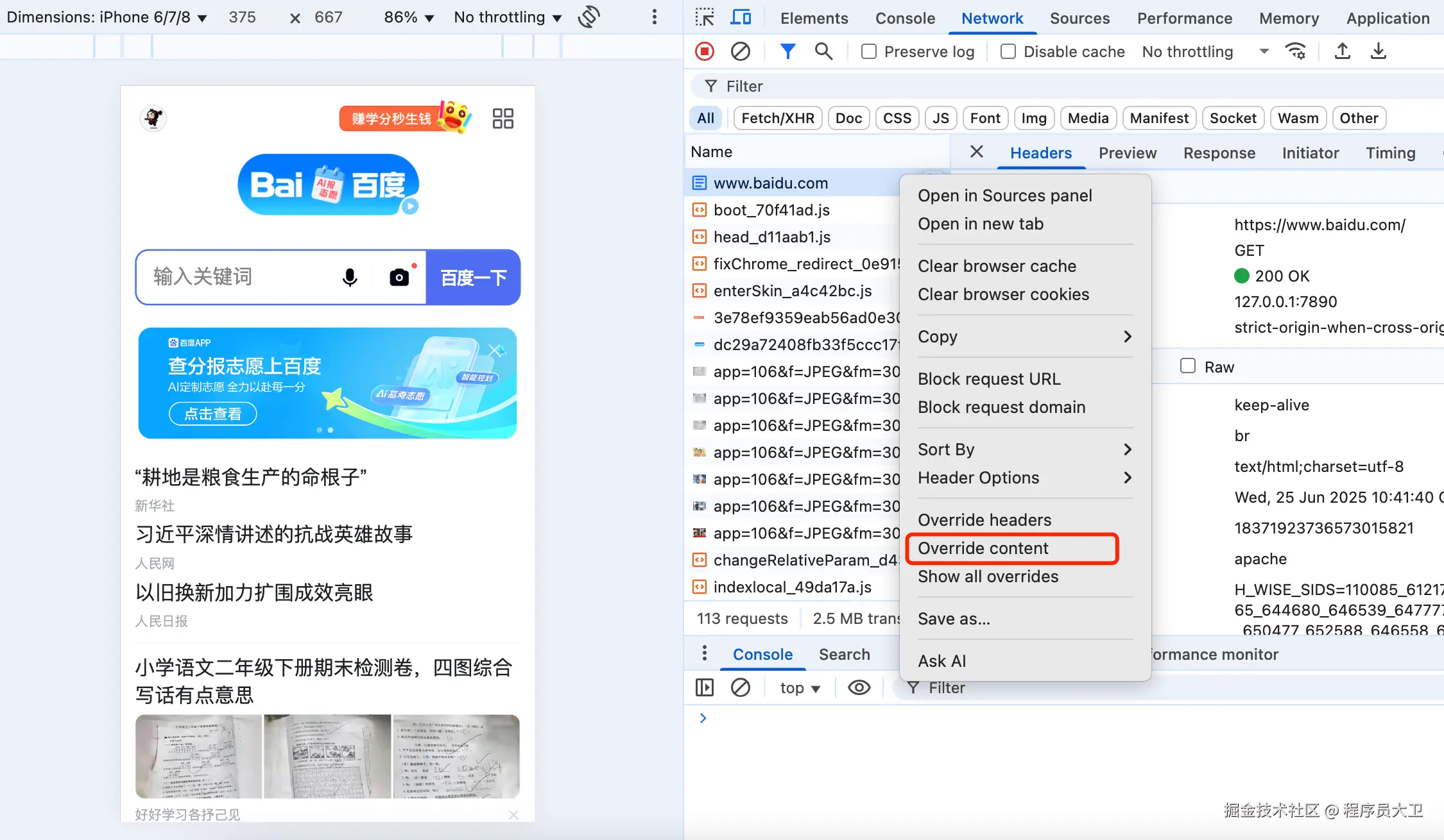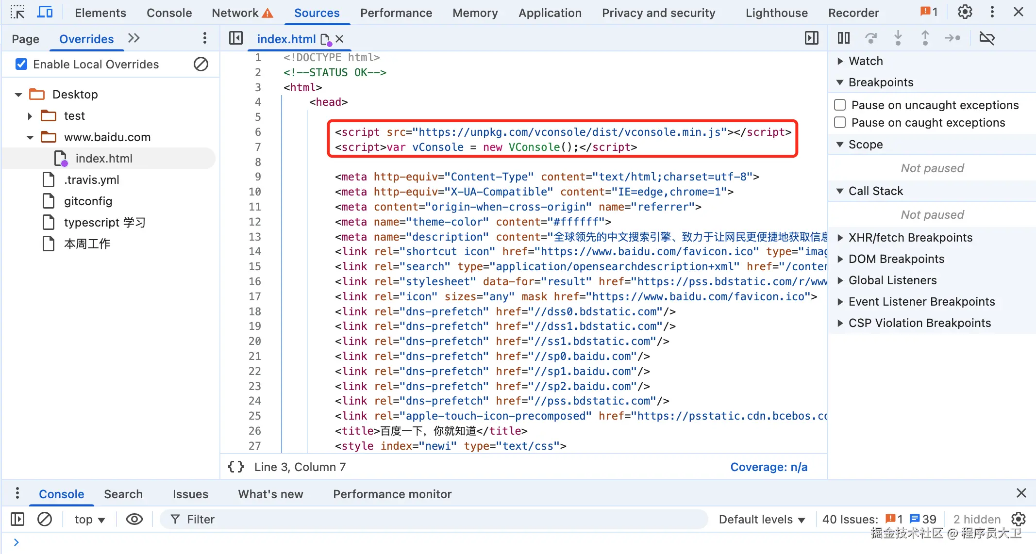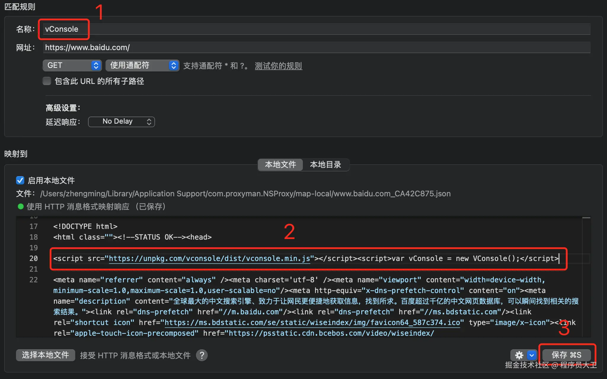 我們可以通過本地映射功能隨意修改線上代碼,或插入自定義腳本來進行調(diào)試。假設(shè)我們要調(diào)試的頁面是 百度首頁,這里以插入 vConsole.js