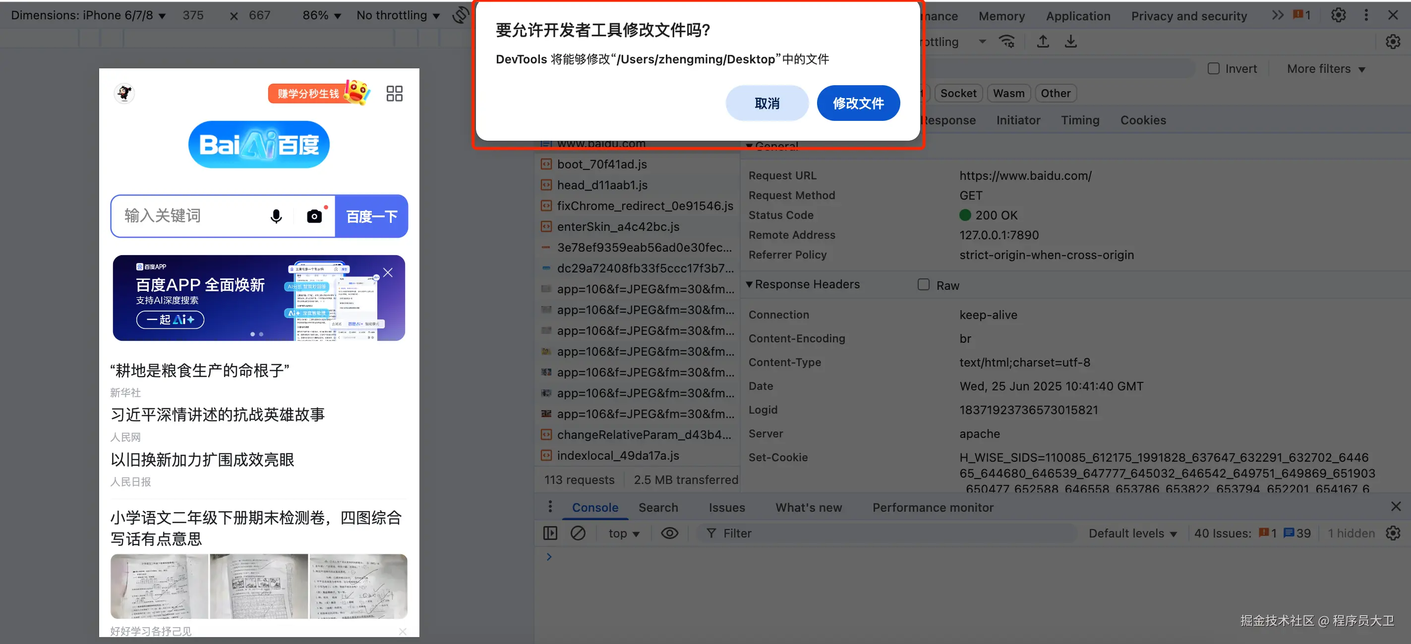 文件夾。隨后會彈出一個對話框,詢問是否允許開發(fā)者工具修改文件,點擊修改文件