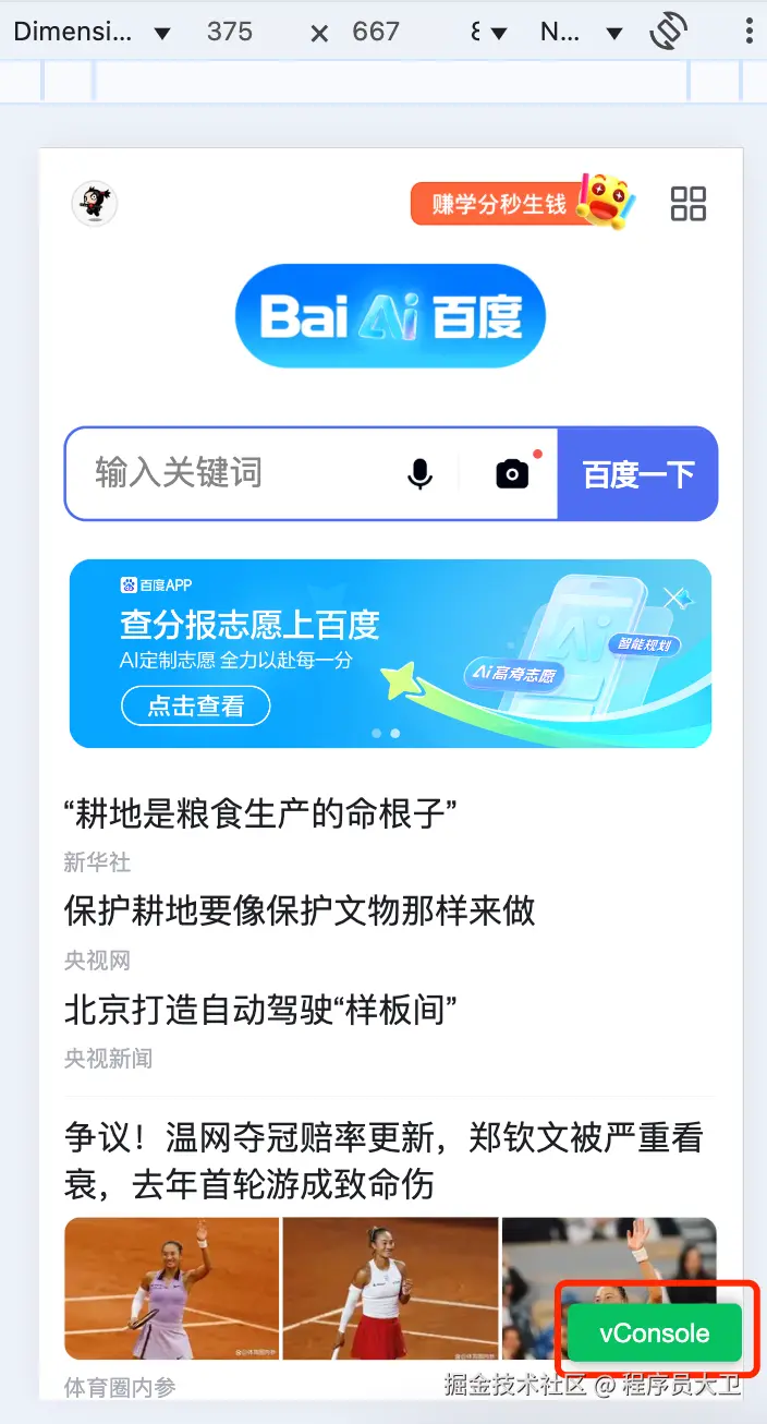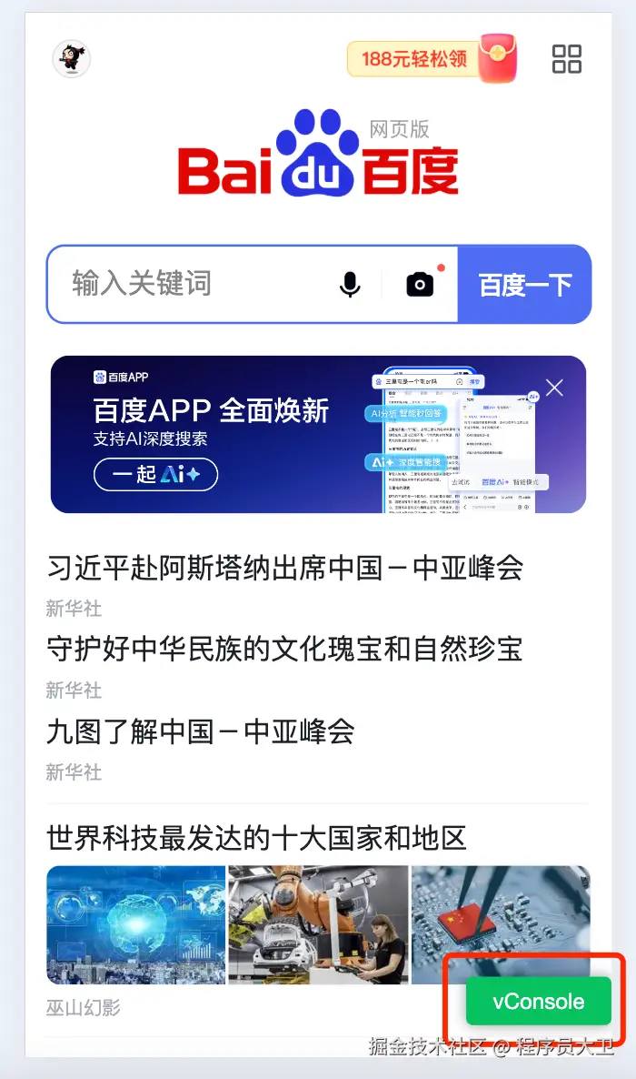 刷新 "百度首頁",就會看到右下角已經(jīng)成功加載了 vConsole