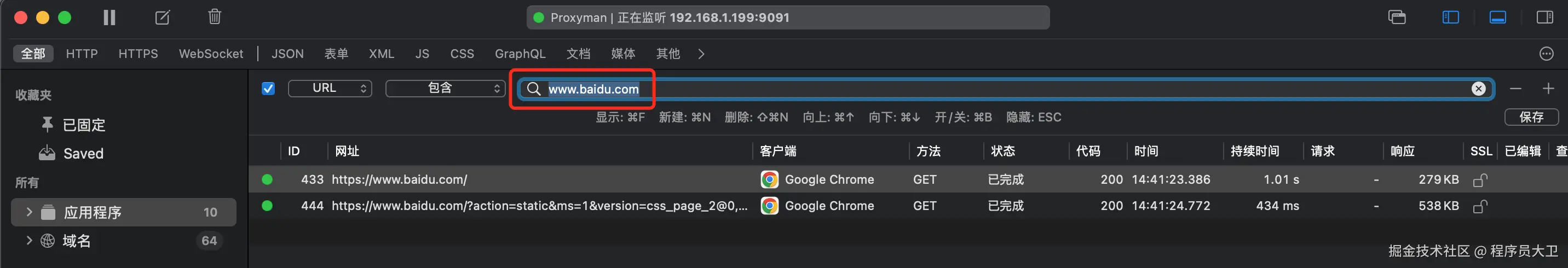 先打開 Proxyman,然后在瀏覽器中訪問 "百度首頁"。接著回到 Proxyman,按下 Command + F