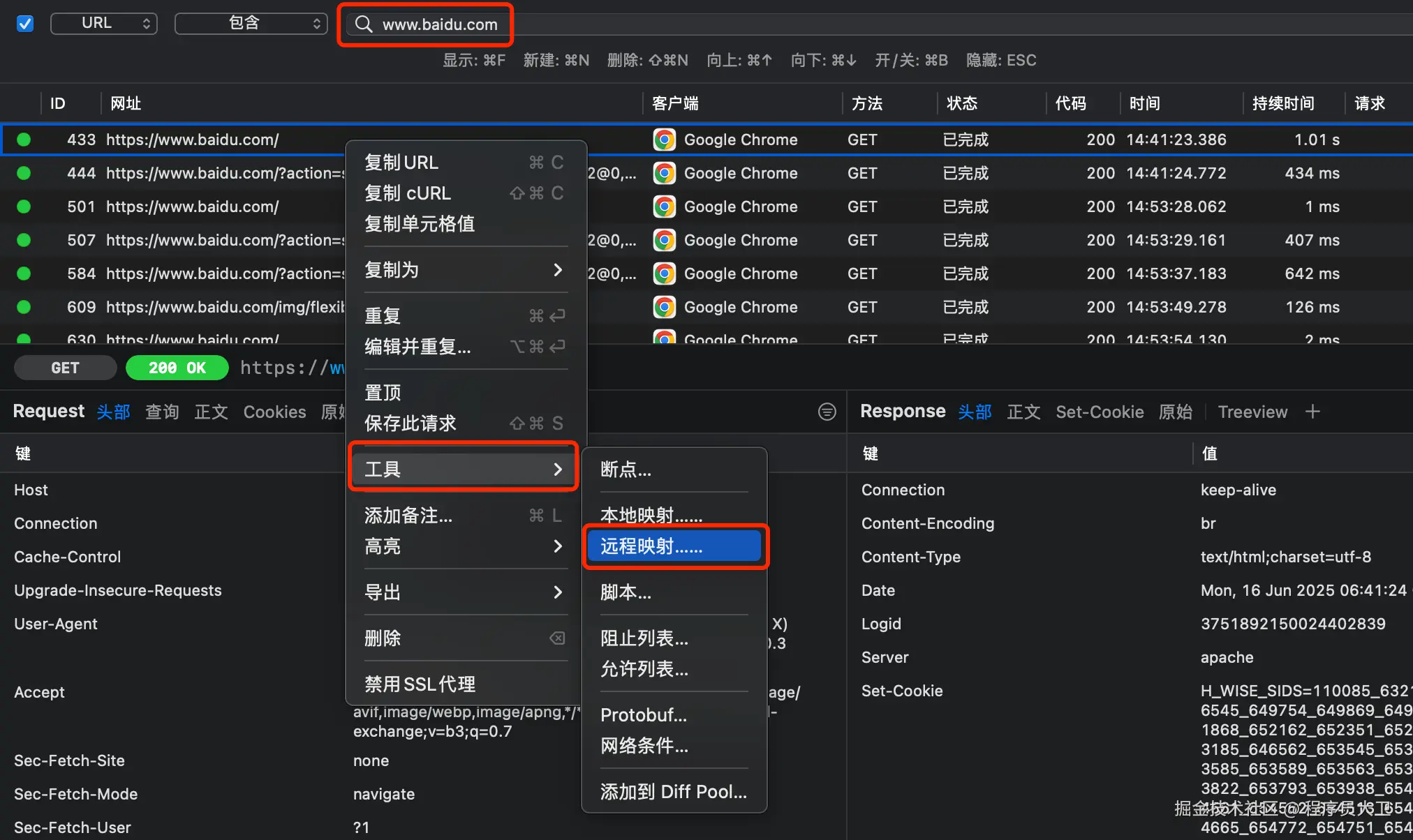 遠程映射與本地映射類似,首先同樣選中百度的請求,右鍵點擊 工具 - 遠程映射