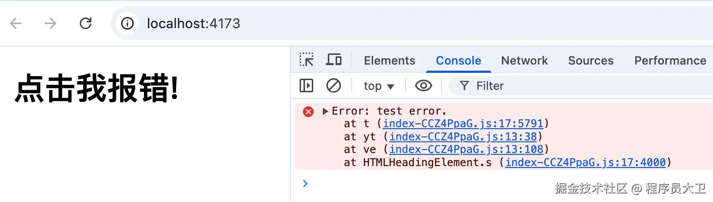 運行以下命令完成構(gòu)建并啟動本地預(yù)覽,接著點擊頁面上的 "點擊我報錯! ",此時控制臺會輸出錯誤信息。