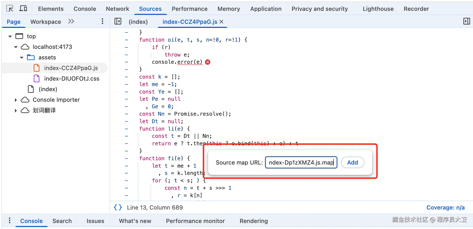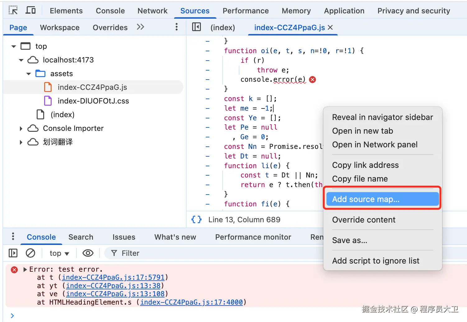 我們會發(fā)現(xiàn)報錯信息無法定位到具體文件和位置。此時可以手動添加 Source Map 文件。