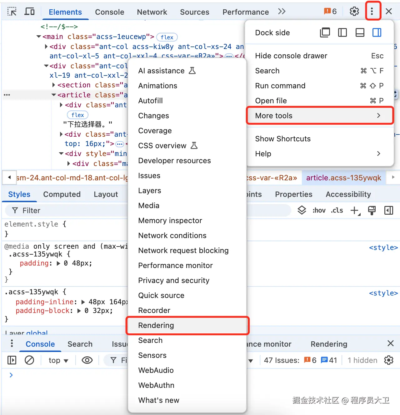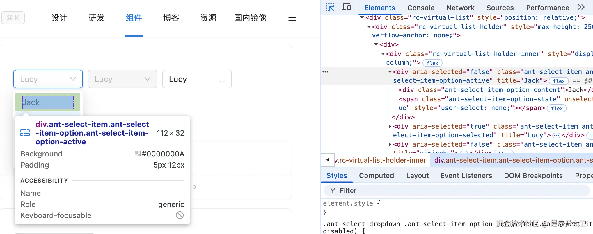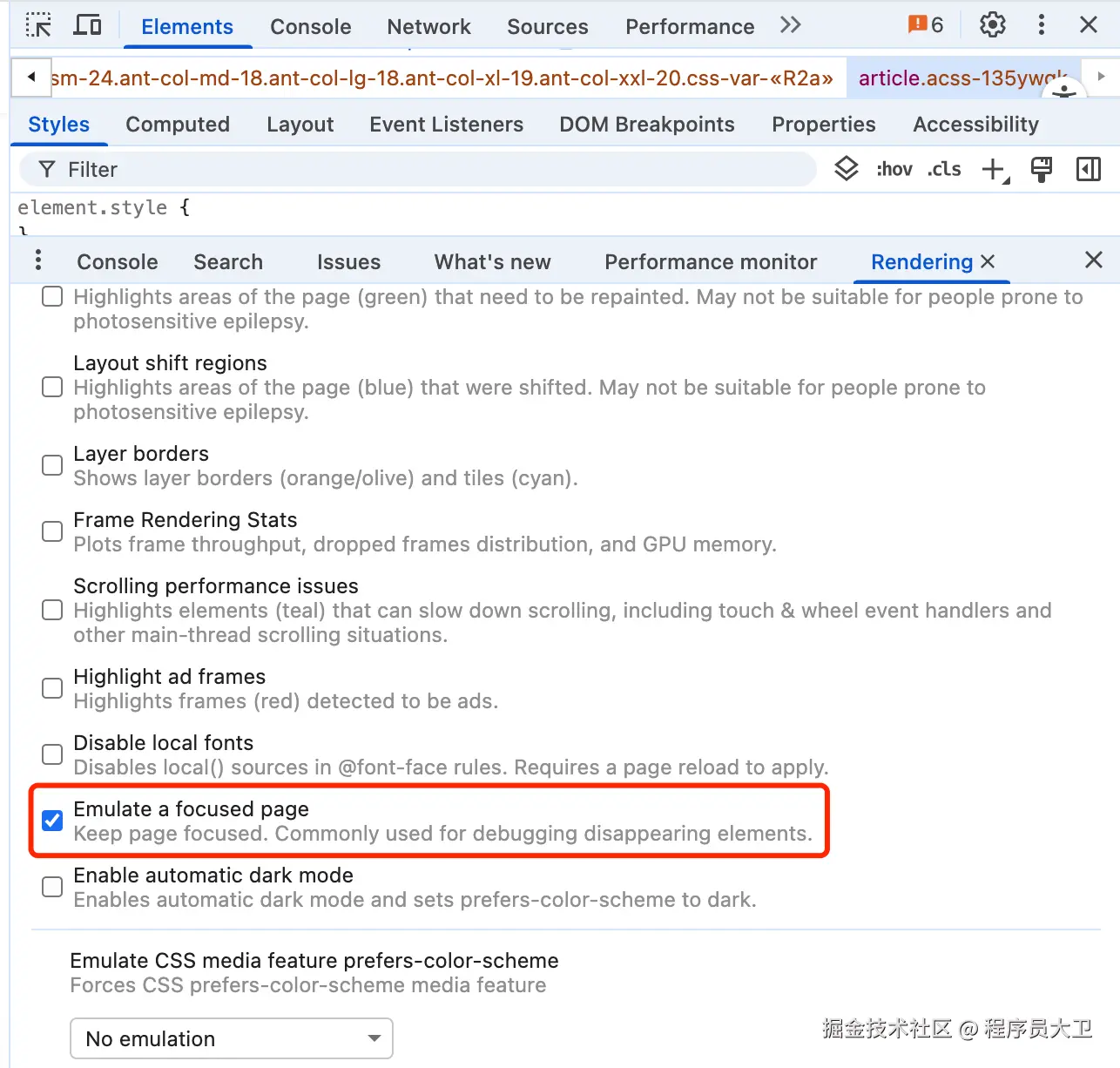 調(diào)試下拉框樣式時,經(jīng)常會遇到這樣的問題:當(dāng) Select 下拉內(nèi)容展開后,一旦切換到瀏覽器 DevTools 面板,下拉內(nèi)容就會自動收起,無法繼續(xù)選中或查看相關(guān)樣式。