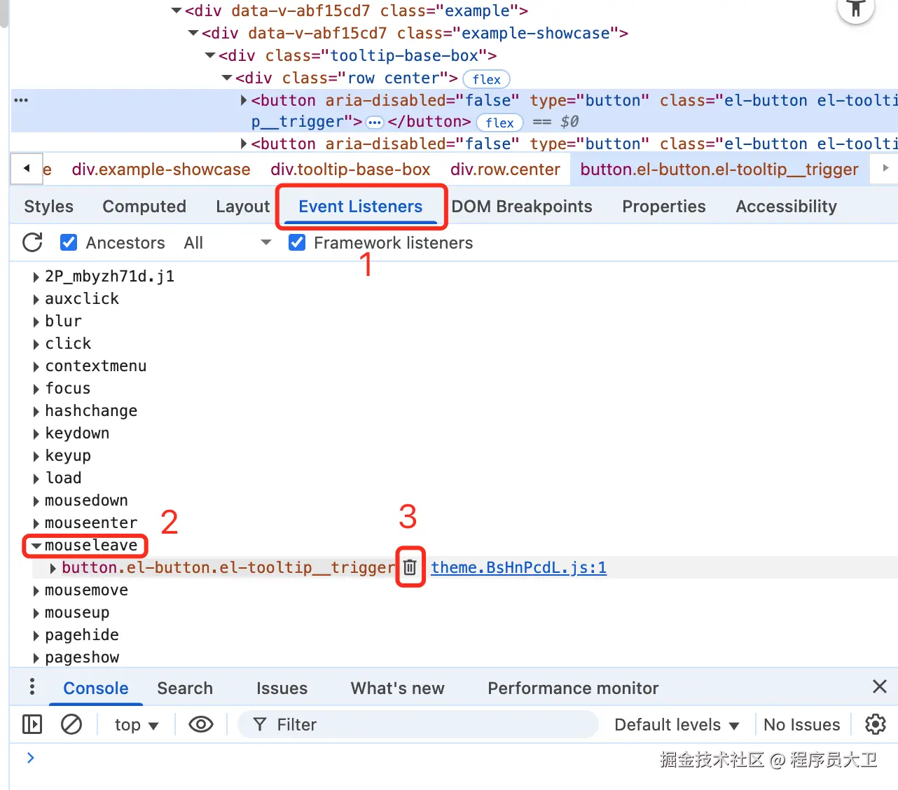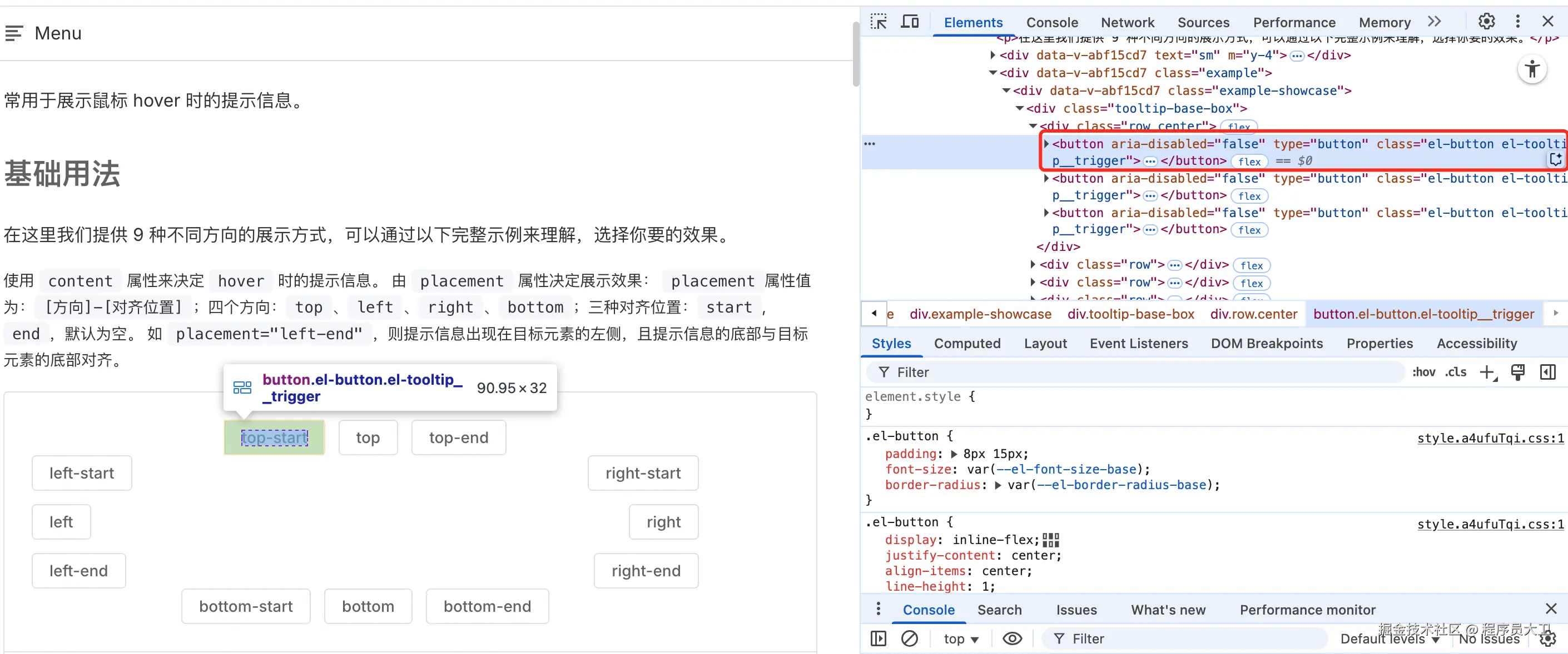 下面以 "Element Plus" 的 Tooltip組件 為例,首先在 DevTools 中選中對應(yīng)的元素: