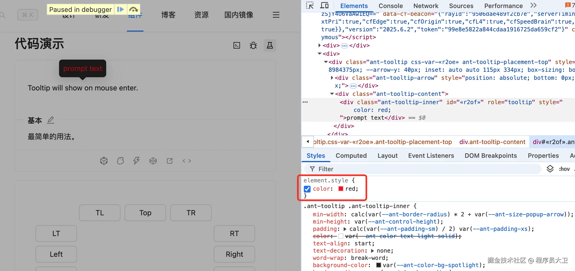 此時,當(dāng)我們再次將鼠標(biāo)懸停在該元素上并移開時,Tooltip 不會自動消失,這樣就可以方便地修改和調(diào)試其樣式了: