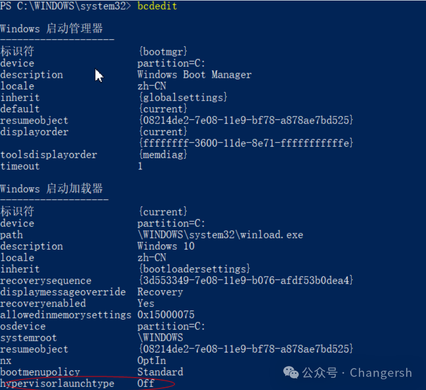 2. 還是不行?在命令行powershell看:bcdedit主要還是最后這個(gè)沒(méi)打開(kāi),hypervisorlaunchtype = off