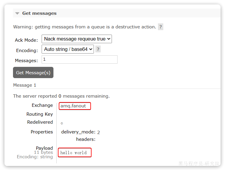 中的舊的消息。然后再次執(zhí)行剛才的消息發(fā)送的代碼,到MQ的控制臺查看消息結(jié)構(gòu):