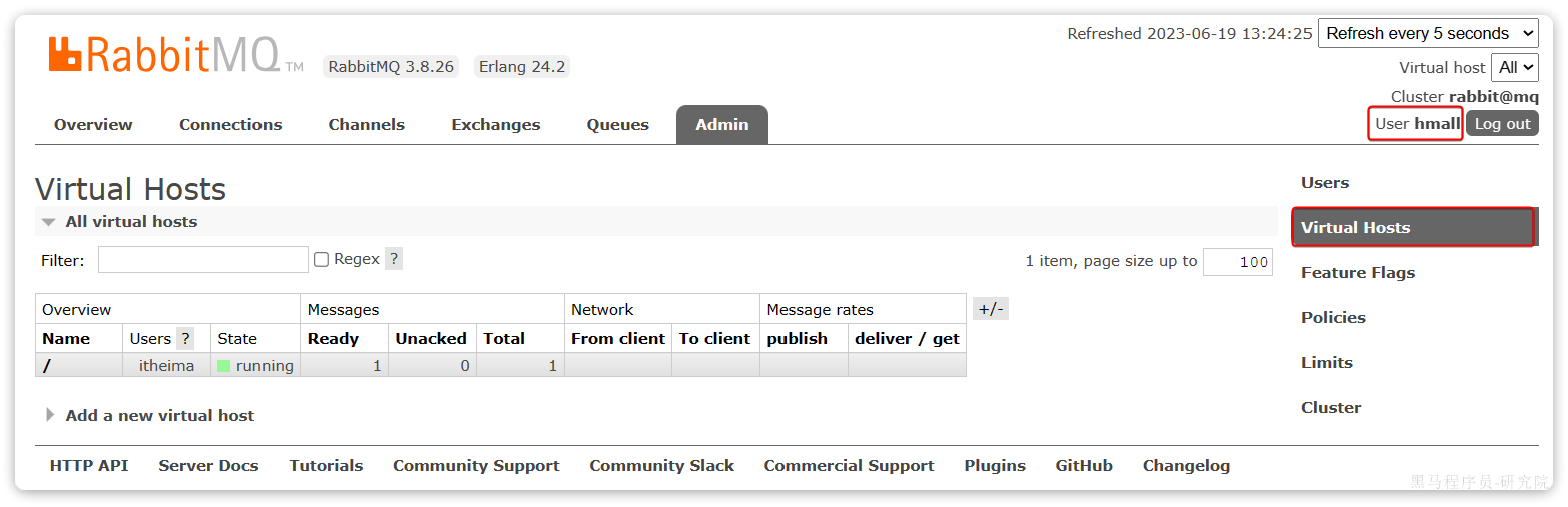 切換到剛剛創(chuàng)建的 用戶登錄,然后點(diǎn)擊Virtual Hosts