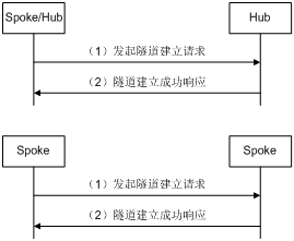 如圖 4所示,注冊階段的具體過程為: (1) Client向Server發(fā)送注冊請求報文,注冊請求報文中包括DVPN節(jié)點的信息。 (2) Server收到注冊請求報文后,根據(jù)配置決定是否對該Client進行身份認證。如果配置為不認證,則直接注冊Client信息并向Client發(fā)送注冊成功響應(yīng),身份認證步驟省略;如果配置為認證,Server向Client回應(yīng)身份認證請求,并指明需要的認證方法(CHAP認證時還返回一個隨機數(shù))。 (3) Client向Server提交自己的身份信息。 (4) Server收到Client的身份認證信息后向AAA服務(wù)器發(fā)起認證,收到AAA認證成功的響應(yīng)后再發(fā)送計費請求,當Server收到計費成功響應(yīng)后,向Client發(fā)送注冊成功響應(yīng)報文,注冊成功報文會攜帶下發(fā)給Client的Hub信息。 3. 隧道建立階段當Spoke注冊成功后,要和Hub建立永久隧道,一個Spoke最多和兩個Hub建立永久隧道。如果在一個VPN域中有兩個Hub,則Hub之間需要建立永久隧道。具體隧道建立流程如圖 5所示: 圖 5 隧道建立流程圖