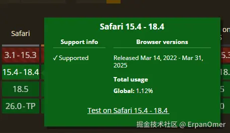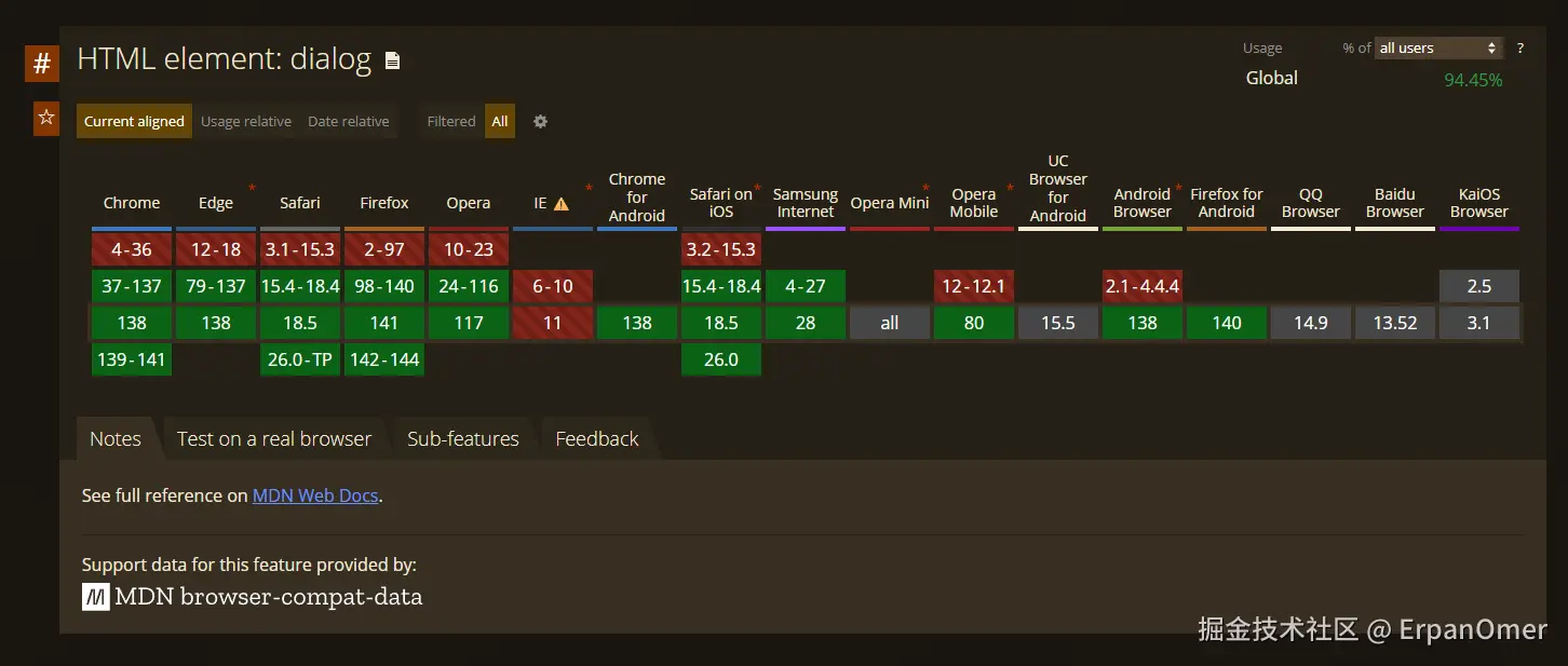 到目前位置,主流瀏覽器幾乎都支持原生dialog,但是值得注意的是 Safari, 它的支持度比起它瀏覽器稍晚,2022年后才開(kāi)始支持,對(duì)于 Safari 瀏覽器 我更推薦大家使用等價(jià)的 polyfill 去解決。(推薦使用 Chrome 官方的 dialog-polyfill)