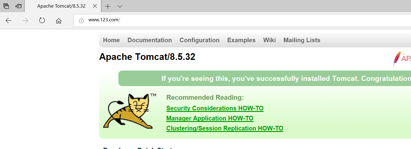 理解這兩種代理的關鍵在于代理服務器所代理的對象是什么,正向代理代理的是客戶端,我們需要在客戶端進行一些代理的設置。而反向代理代理的是服務器,作為客戶端的我們是無法感知到服務器的真實存在的。 總結起來還是一句話:正向代理代理客戶端,反向代理代理服務器。 4、Nginx 反向代理范例:使用 nginx 反向代理 www.123.com 直接跳轉到127.0.0.1:8080 ①、啟動一個 tomcat,瀏覽器地址欄輸入 127.0.0.1:8080,出現(xiàn)如下界面