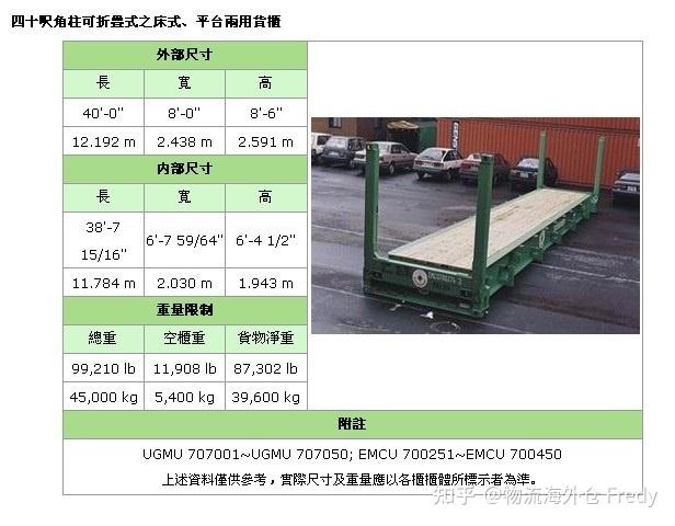 除了以上介紹的常見(jiàn)尺寸外,還有一些特殊尺寸的集裝箱,如10英尺集裝箱、30英尺集裝箱、48英尺集裝箱等,它們通常用于特定類(lèi)型的貨物或特定的運(yùn)輸需求。 總的來(lái)說(shuō),集裝箱尺寸的選擇應(yīng)根據(jù)貨物的體積、重量和運(yùn)輸方式來(lái)確定,以確保貨物能夠安全、高效地運(yùn)輸?shù)侥康牡亍?/p> 照片名稱(chēng):20'GP(General Purpose Containe) 照片名稱(chēng):40'GP(General Purpose Containe) 照片名稱(chēng):40'HQ(High Cube Container 高柜) 照片名稱(chēng):45'HQ(High Cube Container 高柜) 照片名稱(chēng):20'OT(Open Top開(kāi)頂) 照片名稱(chēng):40'OT(Open Top開(kāi)頂) 照片名稱(chēng):20'FR(Flat Rack角柱式折迭平板) 照片名稱(chēng):20'FR(Flat Rack角柱式折迭平板) 照片名稱(chēng):40'FR(Flat Rack角柱式折迭平板) 照片名稱(chēng):40'FR(Flat Rack板框式折迭平板) 照片名稱(chēng):20'ISO TANK(罐式集裝箱) 照片名稱(chēng):40'超高掛衣柜 照片名稱(chēng):20'Refrigerated(冷凍柜) 照片名稱(chēng):40'High Refrigerated(冷凍柜) 備注:集裝箱是按照國(guó)際通用標(biāo)準(zhǔn)設(shè)計(jì)制造。因?yàn)橹圃旃S(chǎng)繁多,所以每個(gè)船東的集裝箱尺寸會(huì)略有差別,但都是大同小異。 該文章在 2025/8/9 13:03:04 編輯過(guò) |
