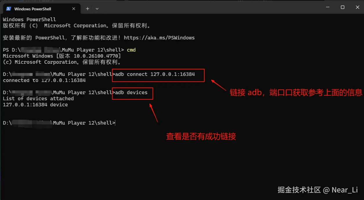 1、啟動(dòng) mumu 模擬器,并打開 mumu 多開工具查看 adb 端口號(hào)2、進(jìn)入 mumu 安裝文件夾,啟動(dòng) adb2.1 安裝目錄查看2.2 打開文件夾,找到 adb.exe 文件2.3 windows 下按 shift + 右鍵啟動(dòng) power shell 或者 cmd注意:如果想全局執(zhí)行 adb 命令,可以在環(huán)境變量中配置 PATH 信息,指向該文件夾下。 3、打開 HBuilder,鏈接 adb3.1 打開模擬器3.2 查看剛剛啟動(dòng)的 adb3.3 如果無法鏈接,可能為模擬器的【開發(fā)者模式】沒有打開進(jìn)入模擬器的設(shè)置界面打開關(guān)于手機(jī),多次點(diǎn)擊系統(tǒng)版本號(hào),即可啟動(dòng)【開發(fā)者模式】4、其他操作斷開當(dāng)前的 adb 鏈接