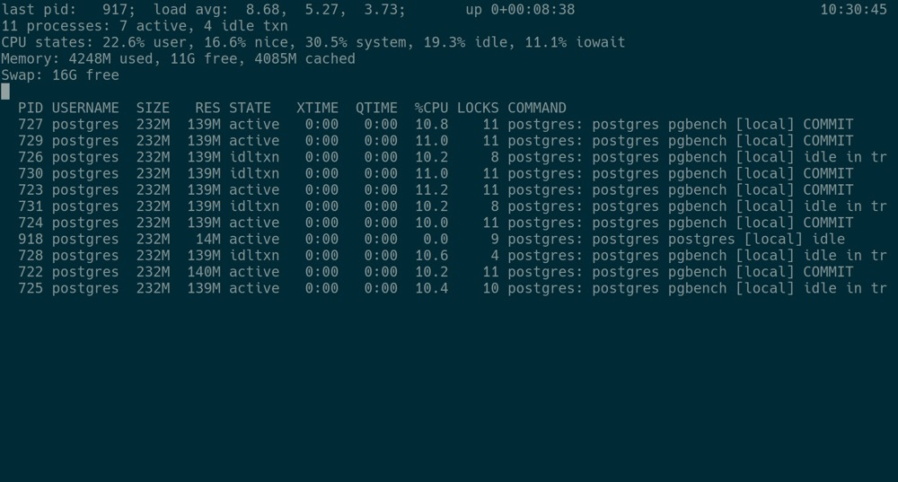 Run Queue Size —— 當前處于 R 狀態(tài)的任務(wù)數(shù) Process List Size —— 系統(tǒng)進程 (線程) 總數(shù) blocked —— 當前處于 D 狀態(tài) (不可中斷,等待 I/O 完成) 的任務(wù)數(shù), 值大表明正在卡磁盤 / 網(wǎng)絡(luò) / NFS / 復(fù)制;常與 iostat %util?&?await 一起看 數(shù)據(jù)庫負載前面聊完了系統(tǒng)負載,那么關(guān)于數(shù)據(jù)庫,如何去衡量"負載"這個指標呢?操作系統(tǒng)和數(shù)據(jù)庫畢竟是分開的,數(shù)據(jù)庫跑在操作系統(tǒng)之上,嚴格來說它們是系統(tǒng)的指標,而非數(shù)據(jù)庫軟件自身的指標,數(shù)據(jù)庫自身也可能因為各種原因出幺蛾子。 因此,回到數(shù)據(jù)庫自身,是否有類似的負載指標?很可惜,原生 PostgreSQL 并沒有類似這樣的指標,但是我們知道,一些 CLI 工具是包含 LOAD 這個指標的,比如 pg_top、pg_activity、pg_views 等等。以 pg_top 為例: ![]() 那么這個 load 是如何計算出來的呢?可惜的是,pg_top 本身 從不計算 負載,只負責"搬運 + 排版"。