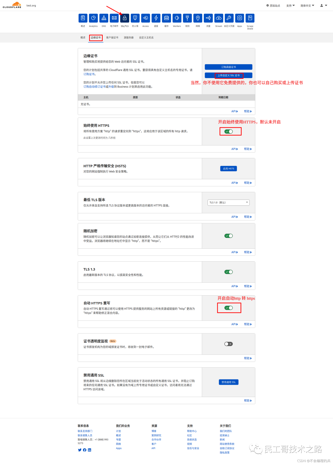 # 如何免費(fèi)申請(qǐng)Https證書這里介紹常用的四種免費(fèi)證書申請(qǐng)方式。 Let’s Encrypt官網(wǎng):https://letsencrypt.org/ Let’s Encrypt 是國(guó)外一個(gè)公共的免費(fèi) SSL 項(xiàng)目,由 Linux 基金會(huì)托管,它的來頭不小,由 Mozilla、思科、Akamai、IdenTrust 和 EFF 等組織發(fā)起,目的就是向網(wǎng)站自動(dòng)簽發(fā)和管理免費(fèi)證書,以便加速互聯(lián)網(wǎng)由 HTTP 過渡到 HTTPS。 Let’s Encrypt安裝部署簡(jiǎn)單、方便,目前Cpanel、Oneinstack等面板都已經(jīng)集成了Let’s Encrypt一鍵申請(qǐng)安裝,網(wǎng)上也有不少的利用Let’s Encrypt開源的特性制作的在線免費(fèi)SSL證書申請(qǐng)網(wǎng)站,總之Let’s Encrypt得到大家的認(rèn)可。 最后選擇Let’s Encrypt,一方面是Let’s Encrypt SSL已經(jīng)被Firefox、Chrome、IE等瀏覽器所支持。另一方面,Let’s Encrypt SSL證書下載和安裝已經(jīng)是傻瓜式的簡(jiǎn)單了。 申請(qǐng)教程官網(wǎng)使用教程:https://certbot.eff.org/ 在界面選擇部署到什么web服務(wù)上和操作系統(tǒng)是那款后,會(huì)自動(dòng)生成如何安裝和使用的步驟流程。 Cloudflare官網(wǎng):https://www.cloudflare.com/zh-cn/cloudflare是一家國(guó)外的 CDN 加速服務(wù)商,還是很有名氣的。提供免費(fèi)和付費(fèi)的加速和網(wǎng)站保護(hù)服務(wù)。cloudflare提供了不同類型的套餐,即使是免費(fèi)用戶,cloudflare 提供的功能也是很全面的。Cloudflare除了提供CDN,也提供免費(fèi)的SSL證書,使網(wǎng)站http變成https加密。Cloudflare一鍵設(shè)置ssl證書,操作簡(jiǎn)單,很多站長(zhǎng)都使用。CloudFlare提供的免費(fèi)SSL證書是UniversalSSL,即通用SSL,用戶無需向證書發(fā)放機(jī)構(gòu)申請(qǐng)和配置證書就可以使用的SSL證書,CloudFlare向所有用戶(包括免費(fèi)用戶)提供SSL加密功能。 不過Universal SSL的服務(wù)對(duì)免費(fèi)用戶有限制,CloudFlare只支持?jǐn)U展支持Server Name Indication(SNI)協(xié)議的現(xiàn)代瀏覽器,這意味著它不支持IE6及之前版本、運(yùn)行Android 2.2或更舊版本的Android瀏覽器。 test.org 并不是我擁有的域名,只是為了演示 隨便填寫的一個(gè)主域 cloudflare注冊(cè):https://dash.cloudflare.com/sign-up 添加站點(diǎn)(你的域名):添加網(wǎng)站,要填寫網(wǎng)站根域名,就是你購(gòu)買域名時(shí)的完整域名名稱(沒有添加任何前綴) 選擇那種套餐(個(gè)人使用推薦免費(fèi)開始) 它會(huì)讓你修改dns為CF所提供(就是你到域名服務(wù)商那取消掉dns解析,托管到CF 網(wǎng)站) 始終https(CF網(wǎng)站默認(rèn)有提供,但是未啟用,不想使用CF的可以上傳證書) FreeSSL官網(wǎng):https://freessl.cn/ 一個(gè)提供免費(fèi)HTTPS證書申請(qǐng)的網(wǎng)站,同一個(gè)域名只支持申請(qǐng)20個(gè) 申請(qǐng)教程準(zhǔn)備域名,選擇供應(yīng)商 填寫郵箱,選擇生成方式 域名提供商(云平臺(tái)DNS解析)處配置TXT記錄值 申請(qǐng)成工,下載證書?證書申請(qǐng)成功,我們可以看到,由于我們生成CSR的方式是離線生成,所以 FreeSSL 并沒有返回給您證書的私鑰,因?yàn)槟乃借€在 KeyManager 中,您只需要將證書保存到 KeyManager,KeyManager 會(huì)自動(dòng)為您進(jìn)行證書私鑰匹配,好,保存成功,這樣我們就成功申請(qǐng)了一張證書。 安裝使用(例如:nginx)FreeSSL官網(wǎng)提供安裝教程:https://blog.freessl.cn/how-do-i-install-an-ssl-certificate-collection/