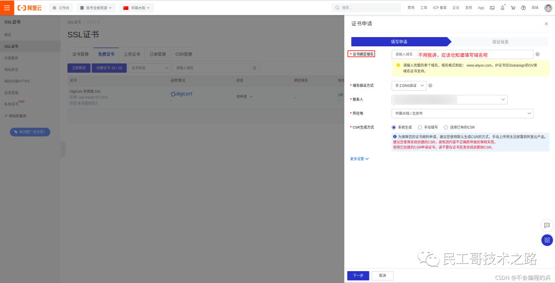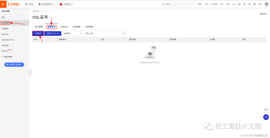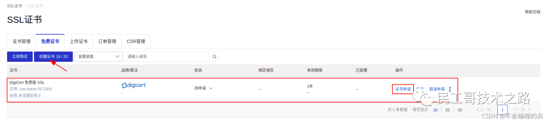 我這里已經(jīng)購(gòu)買過了,阿里云免費(fèi)證書 一個(gè)自然年只能買一次,一次有20個(gè)針對(duì)單個(gè)域名申請(qǐng)的機(jī)會(huì)