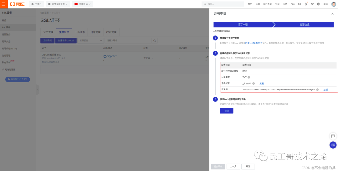 點(diǎn)擊創(chuàng)建證書 點(diǎn)擊證書申請(qǐng) 域名提供商(云平臺(tái)DNS解析)處配置TXT記錄值 提交審核 等待證書申請(qǐng) 等待CA中心審核您的證書申請(qǐng),并在審核通過后為您簽發(fā)證書。DV證書一般會(huì)在2個(gè)小時(shí)內(nèi)完成審核和簽發(fā)。您可以在證書列表中查看證書的狀態(tài)。證書簽發(fā)后,證書狀態(tài)將更新為已簽發(fā)。 部署到服務(wù)器(例子:nginx)阿里云提供SSL證書安裝文檔:https://help.aliyun.com/document_detail/109827.htm?spm=a2c4g.11186623.0.0.1d983103a2FKwt#section-ri1-ayr-evy