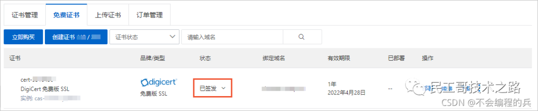 阿里云(云廠商提供)免費(fèi)證書賽門鐵克是 SSL/TLS 證書的領(lǐng)先提供商,為全球一百多萬臺(tái)網(wǎng)絡(luò)服務(wù)器提供安全防護(hù)。選擇賽門鐵克后,證書頒發(fā)機(jī)構(gòu) (CA) 將妥善保護(hù)您的網(wǎng)站和信譽(yù),讓您安枕無憂。免費(fèi)數(shù)字證書,最多保護(hù)一個(gè)明細(xì)子域名,不支持通配符,一個(gè)阿云帳戶最多簽發(fā)20張免費(fèi)證書 保護(hù)一個(gè)明細(xì)域名,例如: mimvp.com,proxy.mimvp.com,blog.mimvp.com,各個(gè)明細(xì)子域名都算一個(gè)域名, 如果每一個(gè)明細(xì)域名,都需要配置SSL,則需要分別申請(qǐng)多個(gè)免費(fèi)的SSL證書。 申請(qǐng)教程申請(qǐng)免費(fèi)DV試用證書文檔:https://help.aliyun.com/document_detail/156645.html