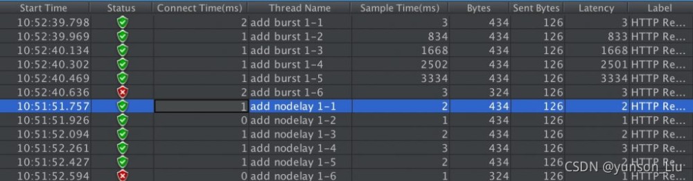 我們加入了burst=4,意思是每個key(此處是每個IP)最多允許4個突發(fā)請求的到來。如果單個IP在10ms內發(fā)送6個請求,結果會怎樣呢? 相比實例一成功數增加了4個,這個我們設置的burst數目是一致的。具體處理流程是:1個請求被立即處理,4個請求被放到burst隊列里,另外一個請求被拒絕。通過burst參數,我們使得Nginx限流具備了緩存處理突發(fā)流量的能力。 但是請注意:burst的作用是讓多余的請求可以先放到隊列里,慢慢處理。如果不加nodelay參數,隊列里的請求不會立即處理,而是按照rate設置的速度,以毫秒級精確的速度慢慢處理。 實例三 nodelay降低排隊時間 實例二中我們看到,通過設置burst參數,我們可以允許Nginx緩存處理一定程度的突發(fā),多余的請求可以先放到隊列里,慢慢處理,這起到了平滑流量的作用。但是如果隊列設置的比較大,請求排隊的時間就會比較長,用戶角度看來就是RT變長了,這對用戶很不友好。有什么解決辦法呢?nodelay參數允許請求在排隊的時候就立即被處理,也就是說只要請求能夠進入burst隊列,就會立即被后臺worker處理,請注意,這意味著burst設置了nodelay時,系統(tǒng)瞬間的QPS可能會超過rate設置的閾值。nodelay參數要跟burst一起使用才有作用。 延續(xù)實例二的配置,我們加入nodelay選項: