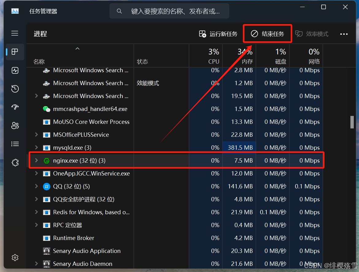 ,打開任務(wù)管理器,找個(gè) Nginx 服務(wù),結(jié)束任務(wù),然后切換到 Nginx 安裝目錄下,雙擊Nginx.exe