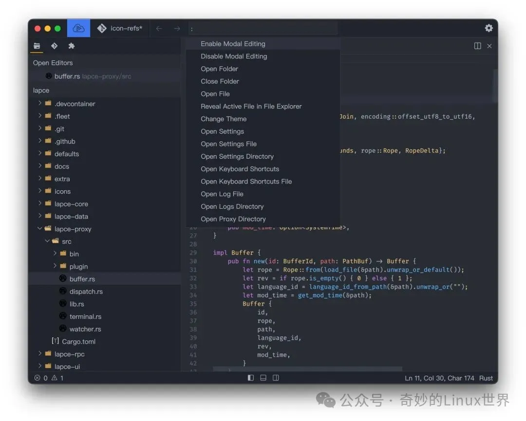 Vim 風(fēng)格的模態(tài)編輯如果你是 Vim 愛好者,Lapce 絕對是你的菜!它內(nèi)置了類 Vim 的模態(tài)編輯,支持快捷鍵切換,熟悉的 hjkl 移動和命令模式一應(yīng)俱全。即便你是新手,也可以輕松切換到普通模式,靈活適應(yīng)。