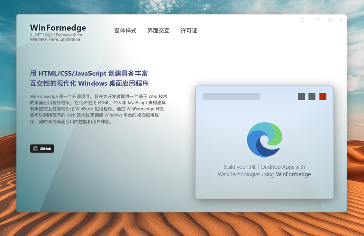 經(jīng)過幾個月的爆肝,目前 WinFormedge 項目已經(jīng)基本可用并已上傳至 NuGet 源。同時附帶的示例程序也開發(fā)完成并隨 WinFormedge 源代碼一并開源。歡迎各位以 Win10/11 為主要生產(chǎn)環(huán)境的 .NET 開發(fā)人員安裝體驗。 項目簡介WinFormedge 是一個基于 Microsoft WebView2 的開源 .NET 庫,開發(fā)者能夠使用 HTML、CSS 和 JavaScript 創(chuàng)建現(xiàn)代化、具有豐富視覺吸力的 WinForms 應用程序。此項目的靈感源于由本人維護的另外一個 .NET WinForm 界面組件 NanUI,與之不同的是 NanUI 基于 Chromium Embedded Framework (CEF) 作為 Web 的渲染引擎,而 WinFormedge 使用了 WebView2 作為渲染引擎,因此 WinFormedge 在目標為 Windows 10/11 的設備上部署時無需打包龐大的 CEF 運行時文件,極大地減少了應用程序分發(fā)包的大小。 功能WinFormedge 的目標是為 .NET 桌面開發(fā)人員提供功能強大且使用便捷的界面組件,目標針對 WinForm 框架,因此使用 WinFormedge 界面框架能夠在為 WinForm 項目帶來全新界面體驗的同時也保留了 .NET 的強大功能。 窗體樣式WinFormedge 目前提供了標準窗體樣式、無標題欄窗體樣式及透明窗體三種類型的窗體: 標準窗體樣式 標準窗體樣式與 WinForm 的標準窗體相同,支持最小化、最大化、關閉等操作。不同的是,整個客戶區(qū)將以開發(fā)者設計的 Web 頁面所覆蓋,當然也可以如下圖所示直接使用現(xiàn)有的 Web 站點。 無標題欄窗體樣式 無標題欄窗體去除了系統(tǒng)標題欄,允許開發(fā)者使用整個窗口區(qū)域這能為界面的設計帶來極大的靈活性。如圖所展示的 WinFormedge 示例程序,窗體移除了系統(tǒng)標準標題欄區(qū)域,使用整個 HTML 頁面來展現(xiàn)軟件的界面。 透明窗體樣式 透明窗體允許開發(fā)者創(chuàng)建完全透明的窗體,適用于需要特殊視覺效果的應用程序。下圖所展示的窗體,在 Windows 系統(tǒng)中使用 HTML 模擬了 macOS Yosemite 的窗體風格,因為使用了 WinFormedge 的透明窗體,因此從窗體的圓角效果、投影效果等等都完全使用 HTML 和 CSS 來實現(xiàn)。 通過調(diào)整背景的 Alpha 通道也能實現(xiàn)更多酷炫的透明和半透明效果。 背景樣式此外,WinFormege 還內(nèi)置了多種窗體背景的樣式,包括傳統(tǒng)的純色背景、透明背景、類似 Win7 的高斯模糊背景以及 Win11 的 Mica 背景等。開發(fā)者可以根據(jù)需要選擇合適的背景樣式,配合 WebView2 的頁面設計以實現(xiàn)不同的視覺效果。 交互功能為了簡化 Web 前端與 WinForm 的功能交互,WinFormege 提供了多種內(nèi)置的命令及 CSS 幫助類以減少開發(fā)者的開發(fā)難度,這些功能包括: 窗體命令窗體命令 app-command 屬性是 WinFormedge 擴展的 HTML 元素屬性,通過在標準的 HTML 元素上添加這個元素屬性以方便地實現(xiàn)窗體的最小化、最大化、全屏及關閉操作。