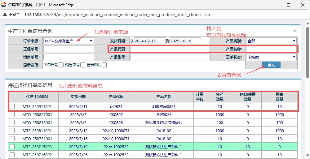 ![]() ![]() 1.進(jìn)入ERP系統(tǒng)之后,在左側(cè)功能菜單里找到“BOE定制”,點(diǎn)開(kāi)后點(diǎn)擊“正常加工”,找到“新增MES組件使用單”。 2.進(jìn)入界面之后,按圖操作:根據(jù)情況選擇入庫(kù)類(lèi)型(正常、制損、材損),然后點(diǎn)擊選擇生產(chǎn)單號(hào)。 3.接下來(lái)來(lái)到下方,先點(diǎn)擊“物料編碼”,然后會(huì)彈出物料界面,按圖操作:先選擇訂單來(lái)源,然后點(diǎn)擊查詢(xún),再選擇對(duì)應(yīng)物料信息。