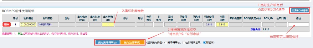![]() 4.選好單號(hào)后,按照?qǐng)D中進(jìn)行操作:先點(diǎn)擊右邊的“獲取BOM清單”,填寫(xiě)“出庫(kù)卷數(shù)”,然后根據(jù)情況選擇“提交制單待審核”或“提交立即審核”。